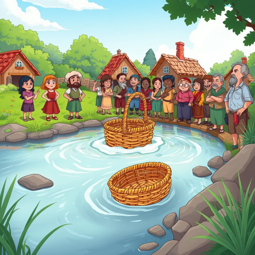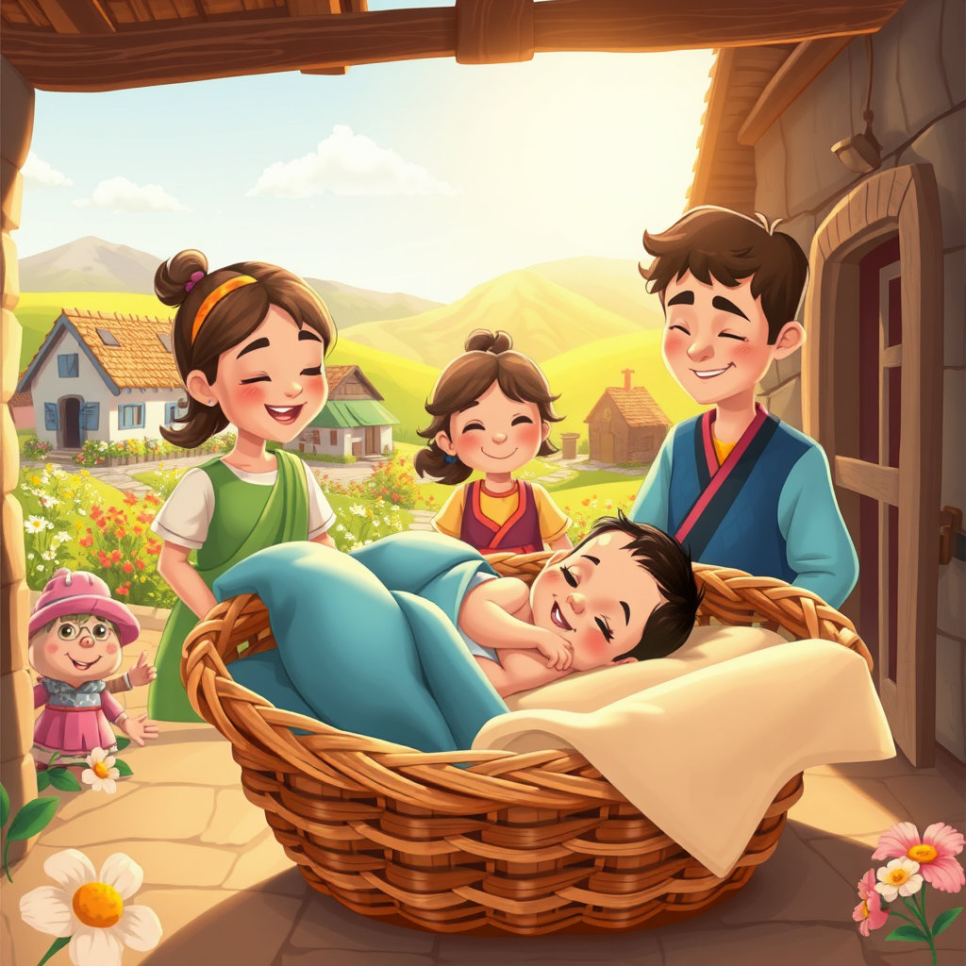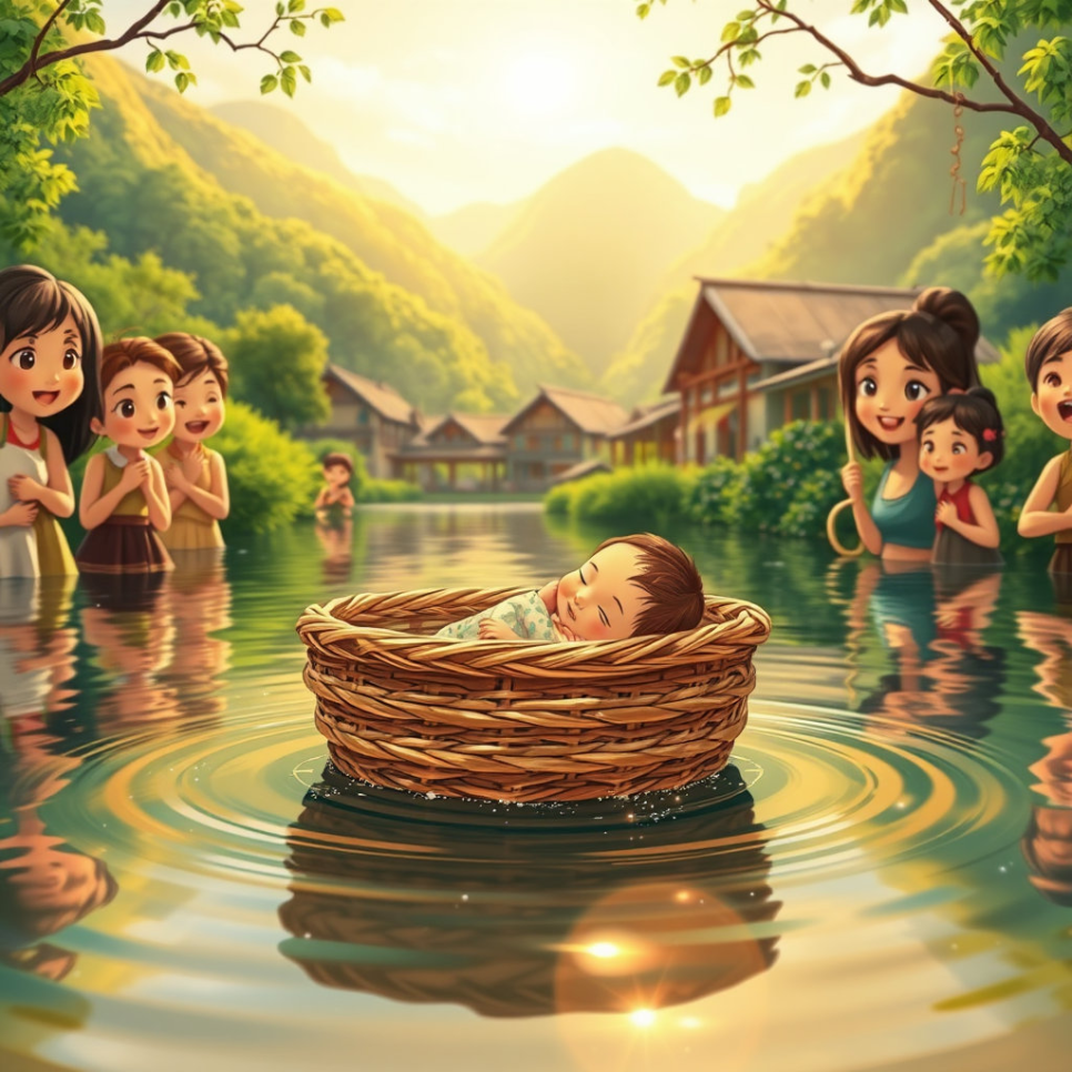 잔잔한 강물 위로 작은 바구니 하나가 떠내려 온 거예요. 마을 사람들은 처음 보는 바구니에 신기해하며 조심스럽게 건져 올렸지요. 그런데 바구니 안에는 놀랍게도 갓난아기가 잠들어 있었답니다! 앙증맞은 아기의 모습에 마을 사람들은 모두 깜짝 놀랐지만, 동시에 따뜻한 마음이 샘솟았어요.