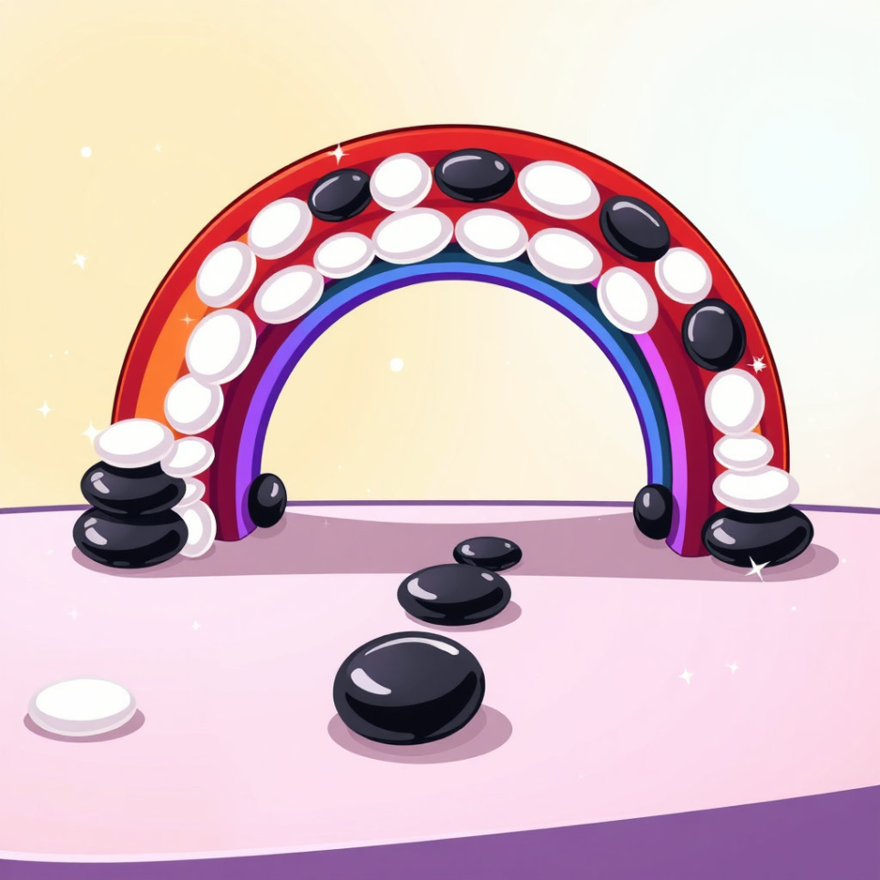 하얀 돌멩이의 용기 덕분에 검은 대장의 마음이 조금 누그러졌습니다. 그러자 신기한 일이 벌어졌어요. 바둑판 위에 햇빛이 비추더니, 먼지 알갱이들이 반짝이며 작은 무지개 빛을 뿜어내기 시작한 거예요! 하얀 돌멩이들과 검은 돌멩이들은 함께 힘을 합쳐 그 빛나는 먼지 알갱이들을 모아 바둑판의 한쪽 끝에서 다른 쪽 끝으로 이어지는 아름다운 무지개 다리를 만들었습니다. 서로 다른 색깔의 돌멩이들이 함께 만든 다리는 더욱 아름다웠죠.