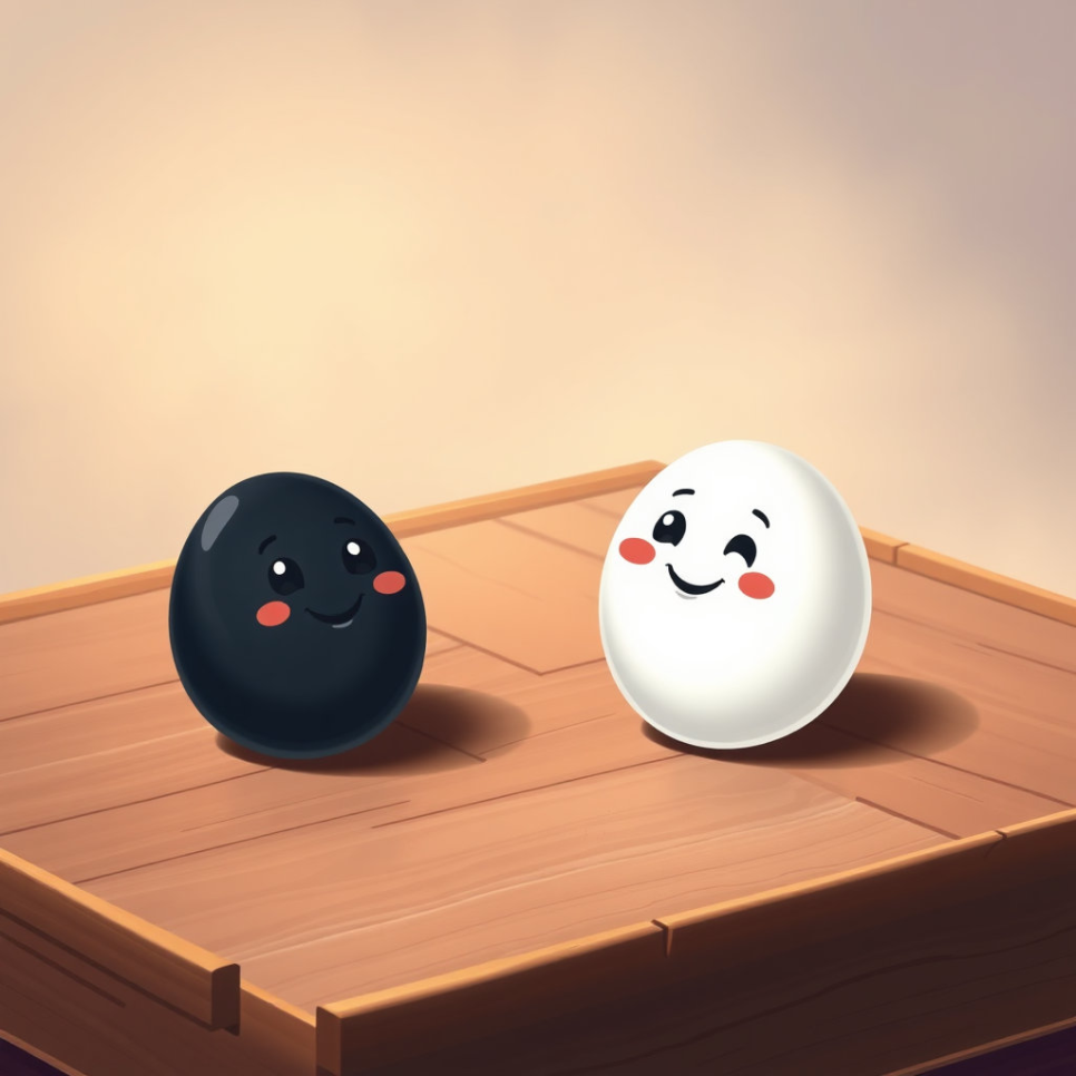 "으…음…" 마침내, 그 작은 하얀 돌멩이에서 아주 작고 귀여운 목소리가 흘러나왔습니다. 딱딱한 표면에 조그마한 금이 가더니, 그 틈으로 아주 작은 눈이 깜빡였어요. "어, 여긴 어디지?" 하얀 돌멩이는 주변을 두리번거렸습니다. 검은색 선들이 가로세로로 그어진 넓고 평평한 세상. 그리고 자기와 똑같이 하얗고 동그란 친구들이 여기저기 흩어져 있었죠. '나는 누구지? 그리고 이 딱딱한 곳은 뭘까?' 하얀 돌멩이는 자신의 매끈한 몸을 조심스럽게 움직여 보았습니다. 데굴, 데굴. 생각보다 잘 굴러갔어요.