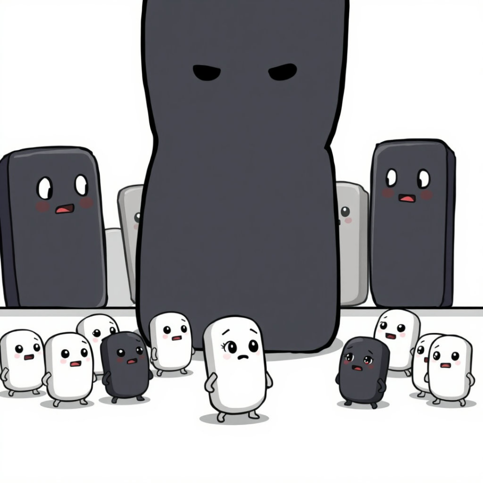 신나게 보물 찾기를 하던 어느 날, 덩치가 유난히 크고 묵직한 검은 돌멩이가 나타났습니다. 다른 검은 돌멩이들보다 훨씬 커서 마치 대장처럼 보였죠. 그 검은 대장은 하얀 돌멩이들이 검은 돌멩이들의 영역 가까이 와서 뛰어노는 것을 보고 심통이 났습니다. "너희 하얀 돌멩이들은 왜 자꾸 우리 쪽으로 넘어오는 거야! 여기가 어디라고 함부로 돌아다녀!" 험악한 표정으로 소리치는 검은 대장 때문에 하얀 돌멩이들은 깜짝 놀라 움츠러들었습니다.