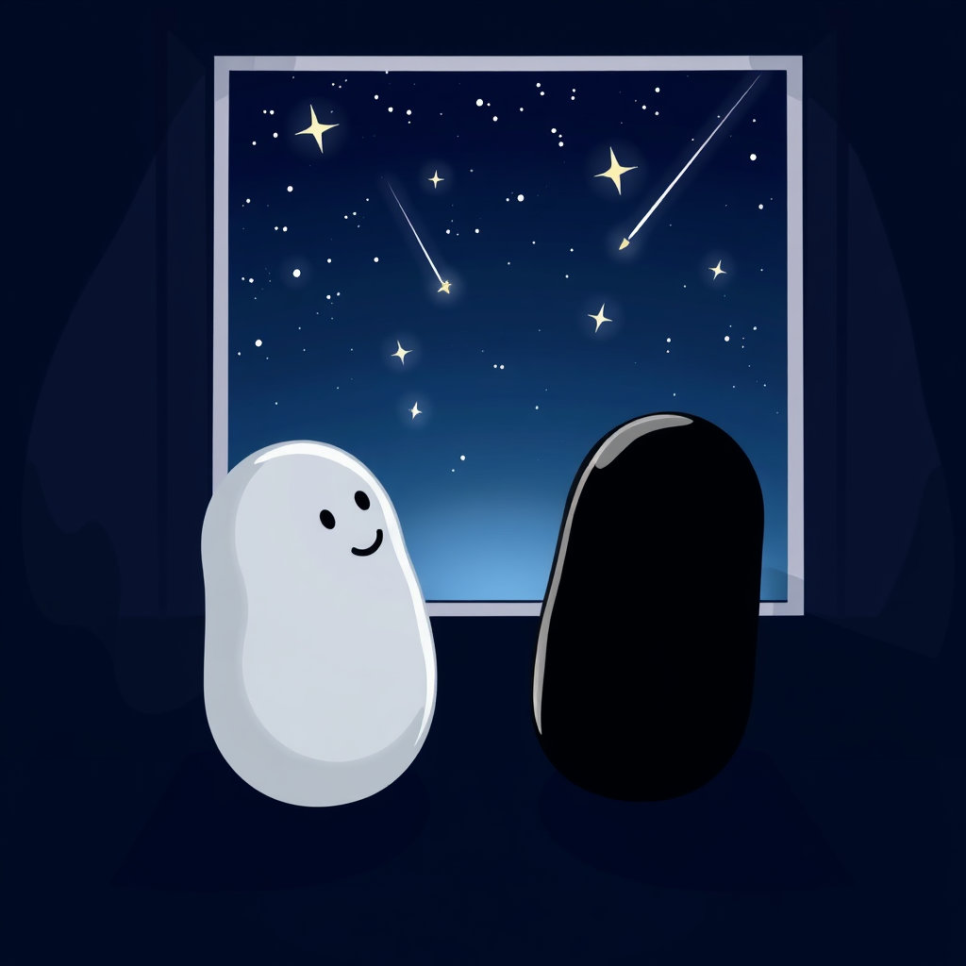 어느덧 시간이 흘러 바둑판 위에도 어둠이 찾아왔습니다. 창밖에서는 반짝이는 별들이 빛나고 있었죠. 그때, 하얀 돌멩이 하나가 "저 별들 좀 봐! 마치 우리처럼 반짝인다!" 하고 외쳤습니다. 그러자 다른 돌멩이들도 창밖을 바라보았어요. 신기하게도, 밤하늘에서 별똥별이 하나 떨어졌습니다. 그 순간, 바둑판 위의 모든 돌멩이들에게서 작은 빛이 뿜어져 나오기 시작했어요. 마치 별똥별을 따라 작은 불꽃놀이를 하는 것처럼 아름다운 광경이었죠. 하얀 돌멩이들과 검은 돌멩이들은 함께 밤하늘을 바라보며 특별한 밤을 보냈습니다.