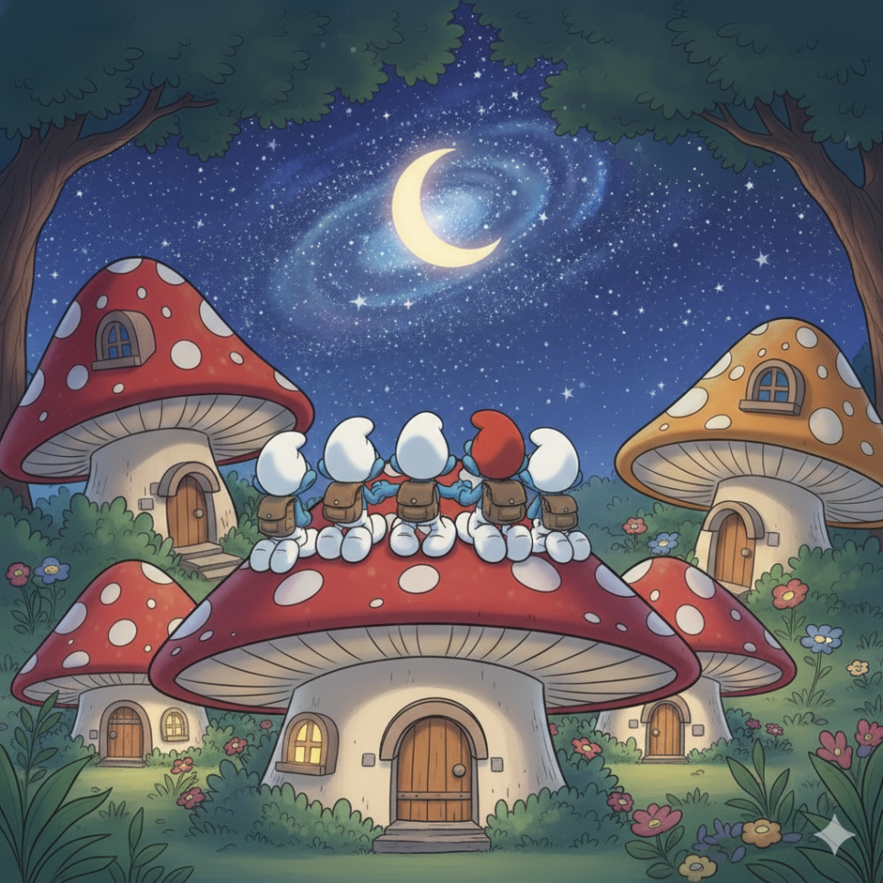 모두가 행복하게 춤추며 하루를 마무리하고, 다음 모험을 꿈꾸며 잠드는 스머프들의 평화로운 밤.