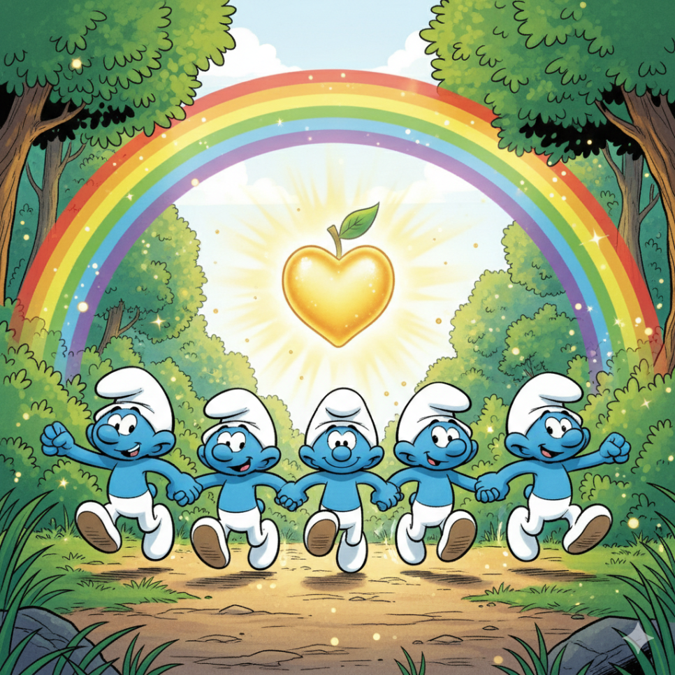 가까스로 가가멜을 따돌린 스머프들은 숲의 가장 깊고 은밀한 곳에 위치한 '무지개 동굴'에 도착했습니다. 동굴 안은 어두울 줄 알았지만, 벽마다 박힌 보석들이 별처럼 빛나고 있었어요. 그리고 그 동굴의 정중앙, 마치 하늘에서 내려온 빛을 머금은 듯한 아름다운 나무 한 그루가 서 있었습니다. 나무 꼭대기에는 온 세상을 다 비출 만큼 눈부시게 빛나는 '황금 하트 열매'가 단 한 알 열려 있었죠.
