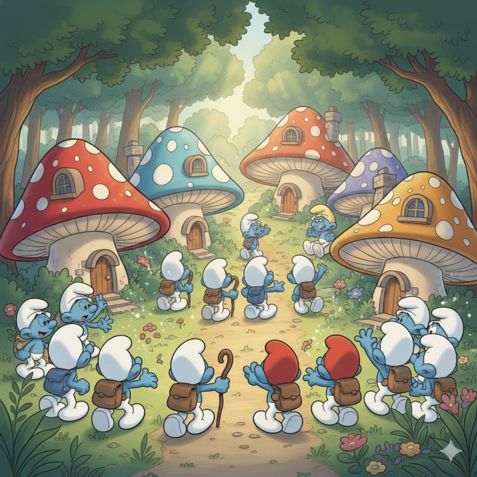 깊은 숲속, 사람들의 눈에는 보이지 않는 자욱한 안개를 지나면 동화 같은 마을이 나타나요. 바로 파란 피부에 하얀 모자를 쓴 꼬마 요정, 스머프들이 사는 곳이죠. 이곳의 집들은 커다란 버섯 모양이고, 창밖으로는 항상 달콤한 라즈베리 향기가 풍겨온답니다.