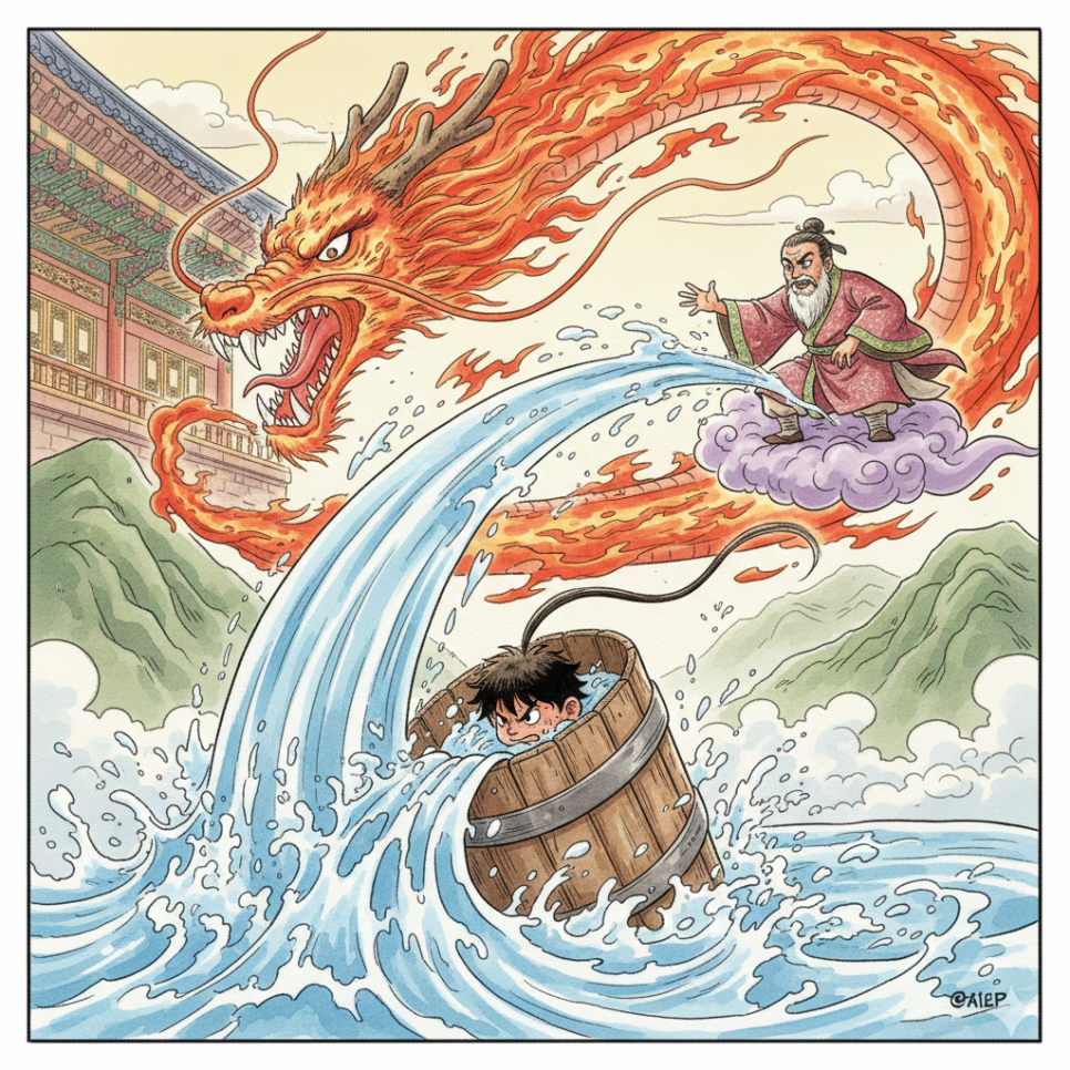묘선이를 구하러 가는 길목에서 머털이는 꺼꾸와 마주쳤어요. 꺼꾸는 왕질악에게 배운 검은 도술로 거대한 불꽃 용을 만들어냈죠. "하하! 머털이 주제에 감히 누굴 구한다고? 이 불꽃 맛 좀 봐라!" 꺼꾸의 공격에 머털이는 위기에 처했어요. 하지만 머털이는 당황하지 않았어요. '바위를 옮기던 그때의 힘을 발휘하자!'
