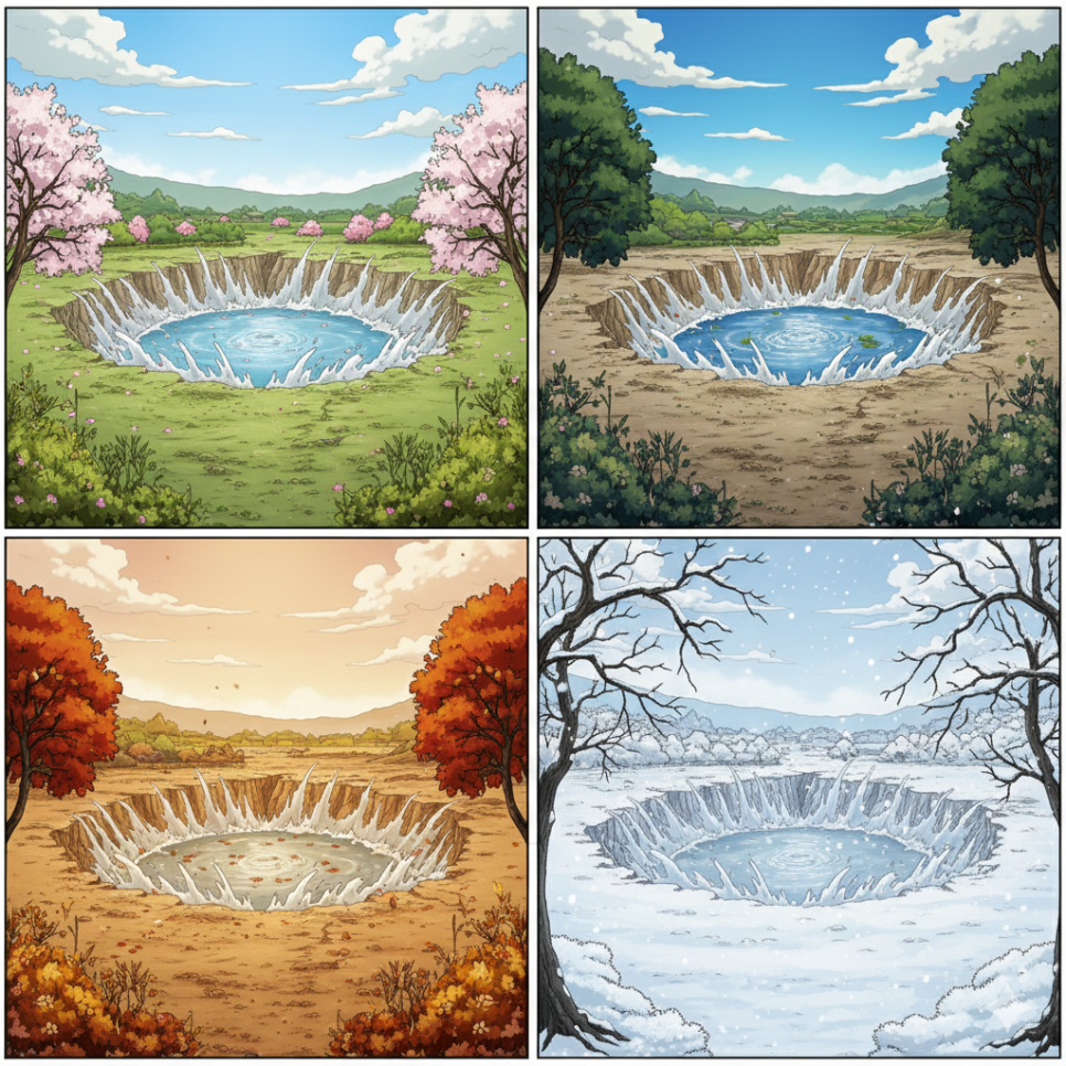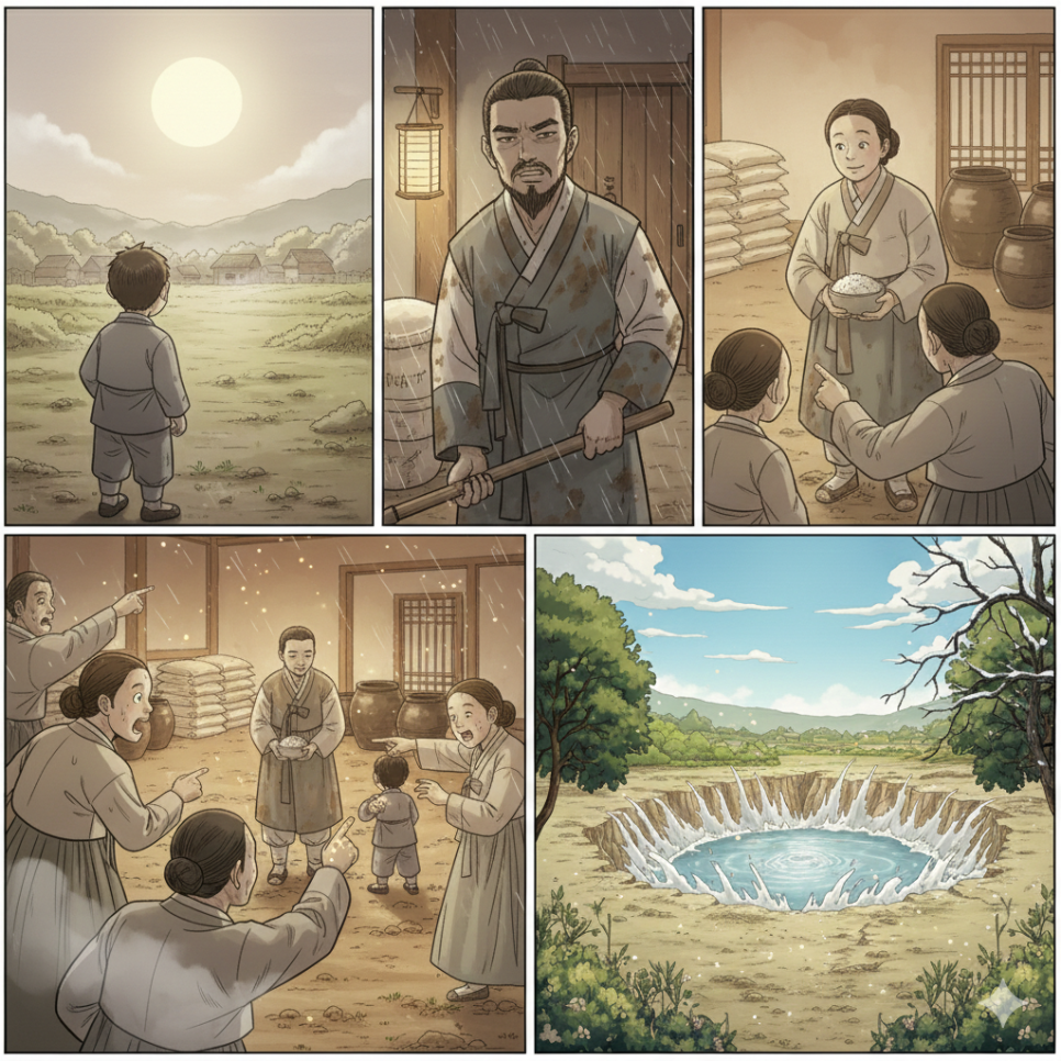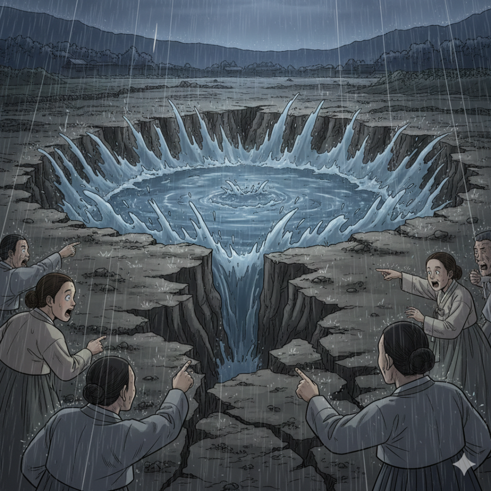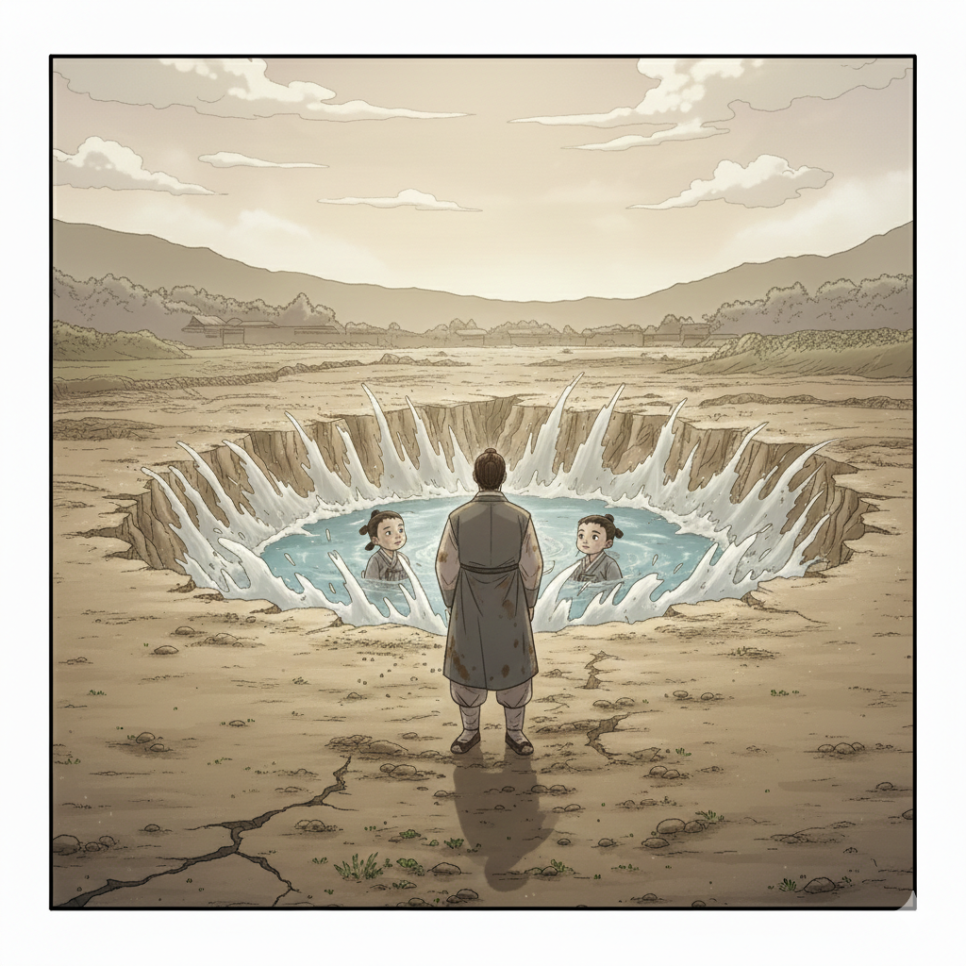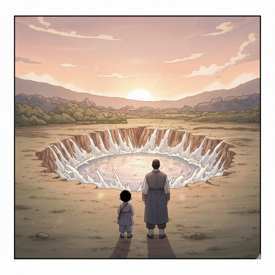새벽이 되자 갑자기 큰 소리가 났다. 땅이 갈라지며 물이 솟구쳤다. 마을 끝의 축축한 땅은 순식간에 깊은 연못으로 변했다. 물은 맑고 깊었으며, 하늘을 그대로 담아내고 있었다. 사람들은 놀라 달려왔고, 장자의 집 쪽 땅은 무너져 내렸다. 욕심으로 쌓아 올린 집은 물 앞에서 너무도 약했다. 스님은 사람들 속에서 조용히 말했다. “땅은 마음을 비추는 거울과 같습니다.” 그 말이 끝나자 스님은 어느새 사라지고 없었다.