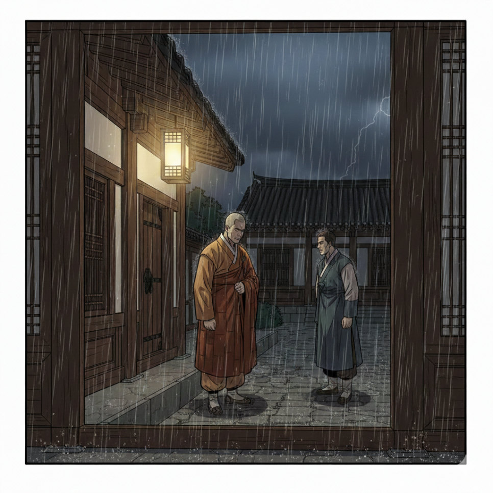 그날 밤, 하늘이 갈라지는 듯한 천둥이 울렸다. 비는 더욱 거세졌고, 바람은 나무를 흔들었다. 장자는 잠에서 깨어 창밖을 내다보았다. 마을 끝의 축축한 땅에서 이상한 빛이 번쩍였다. 땅이 숨을 쉬는 것처럼 들썩였고, 물소리가 점점 커졌다. 스님은 빗속에서 조용히 두 손을 모아 하늘을 향해 서 있었다. 그 모습은 마치 오래된 약속을 지켜보는 사람 같았다. 장자는 알 수 없는 두려움에 가슴이 뛰었다. 그날 밤, 아무도 깊이 잠들지 못했다.