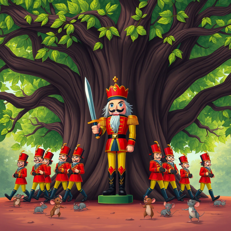 깊은 밤, 모두가 잠든 시간, 클라라는 문득 호두까기 인형이 걱정되어 살금살금 방으로 돌아왔어요. 그런데, 맙소사! 방 안의 풍경이 이상하게 변해 있었어요. 크리스마스 트리는 점점 더 커지고, 장난감 병정들은 살아 움직이는 듯했어요.