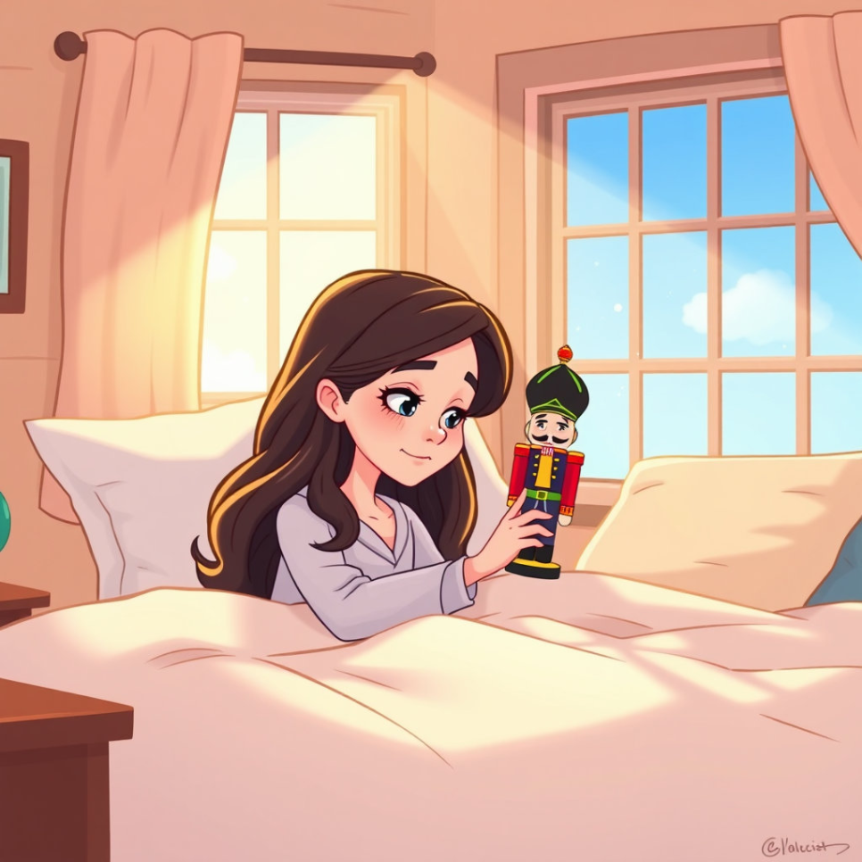 눈을 뜨니, 클라라는 자신의 침대에 누워 있었어요. 옆에는 어젯밤 소중히 안고 잤던 호두까기 인형이 놓여 있었죠. 모든 것이 꿈이었을까요? 하지만 클라라의 마음속에는 달콤했던 과자의 나라와 용감했던 왕자님의 모습이 생생하게 남아 있었답니다. 그리고 클라라는 그 호두까기 인형을 더욱 소중하게 여기게 되었어요. 그날 밤의 마법 같은 이야기는 클라라의 마음속에 영원히 아름다운 추억으로 남을 거예요.