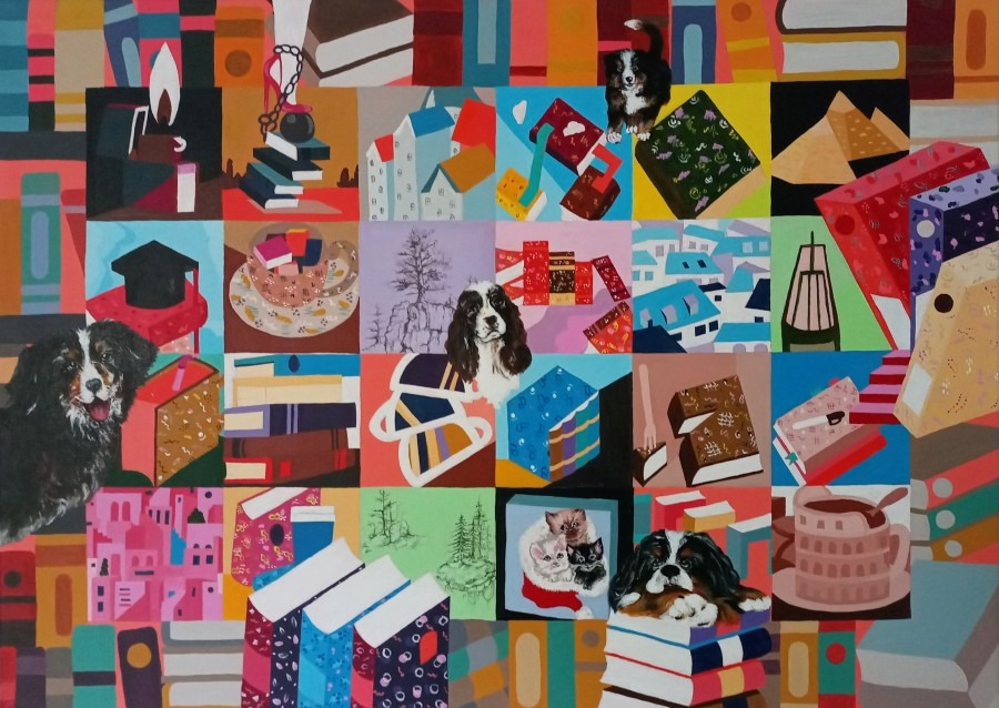 책 표지의 창문을 통해 책 속으로 들어가고 싶은 마음, 달마시안 강아지의 눈이 피라미드를 바라보며 품는 기원들, 코로나 세포들처럼 살아 있는 패턴들이 생명을 느끼게 한다. 세포 같은 삶, 작은 것들이 모여 만든 삶의 과정들, 인간들이 모여 만들어낸 문명 중에서 책은 가장 행복한 공간이다.