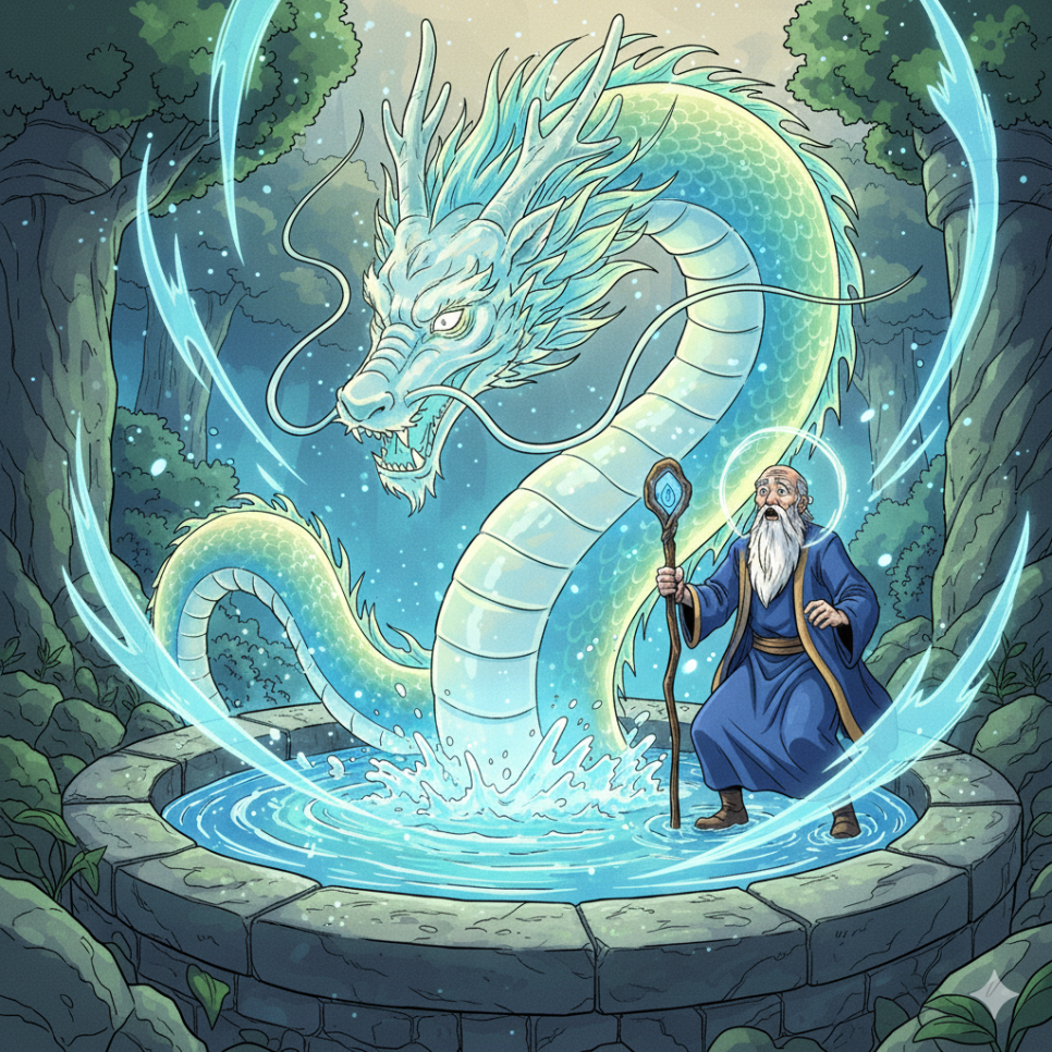 그 순간! 우물 속에서 커다란 용 한 마리가 천천히 모습을 드러냈습니다. 용의 비늘은 영롱한 빛을 내며 반짝였고, 긴 수염이 물결처럼 흔들렸습니다. 할아버지는 너무 놀라 뒷걸음질을 쳤지만, 용은 무섭게 보이지 않았습니다. 오히려 온화하고 신비로운 기운이 느껴졌지요.