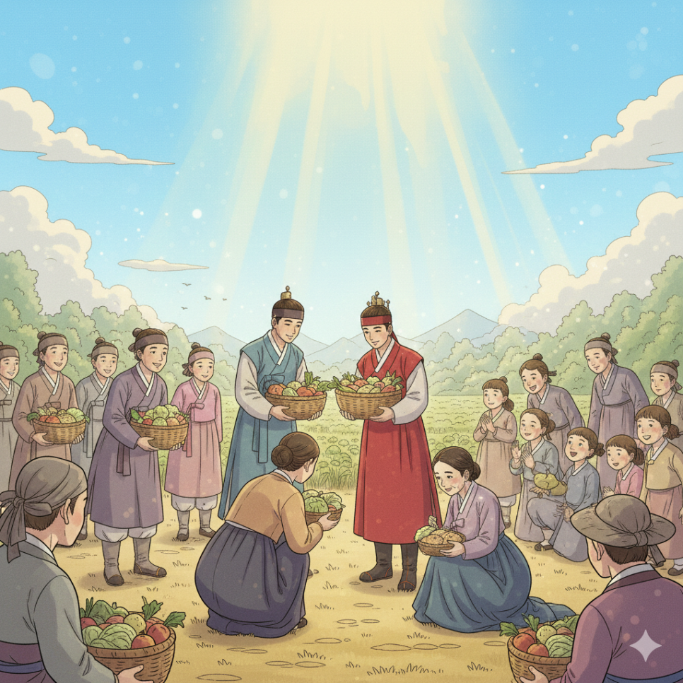 혼인식은 성대하게 치러졌습니다. 하지만 알영은 화려한 의식보다 백성들과 함께 기쁨을 나누고 싶었습니다. 그래서 혼인식이 끝난 후, 가난한 사람들을 위한 큰 잔치를 열었습니다. 배고픈 사람들에게는 음식을 나누어주고, 옷이 없는 사람들에게는 옷을 선물했습니다.