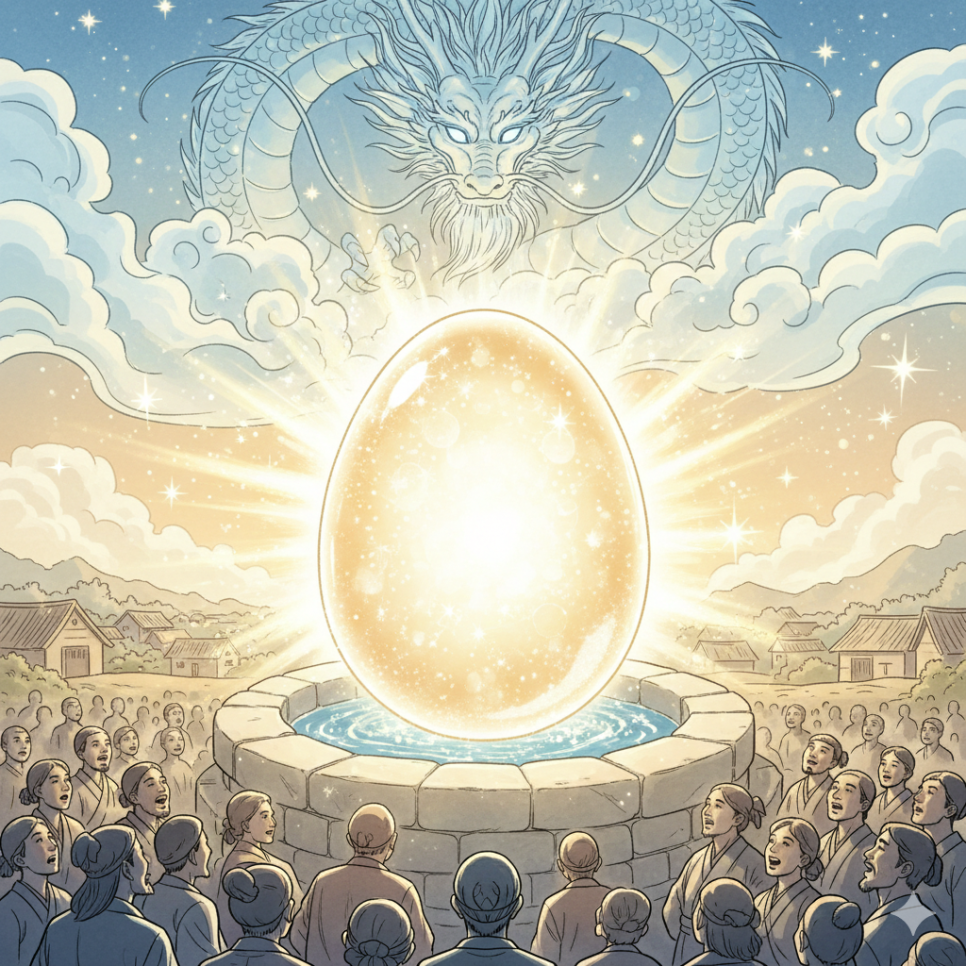 마을 사람들은 신비로운 알을 마을 회관에 모시고 밤낮으로 정성껏 돌보았습니다. 며칠이 지났을까요? 알에서 이상한 소리가 들리기 시작했습니다.