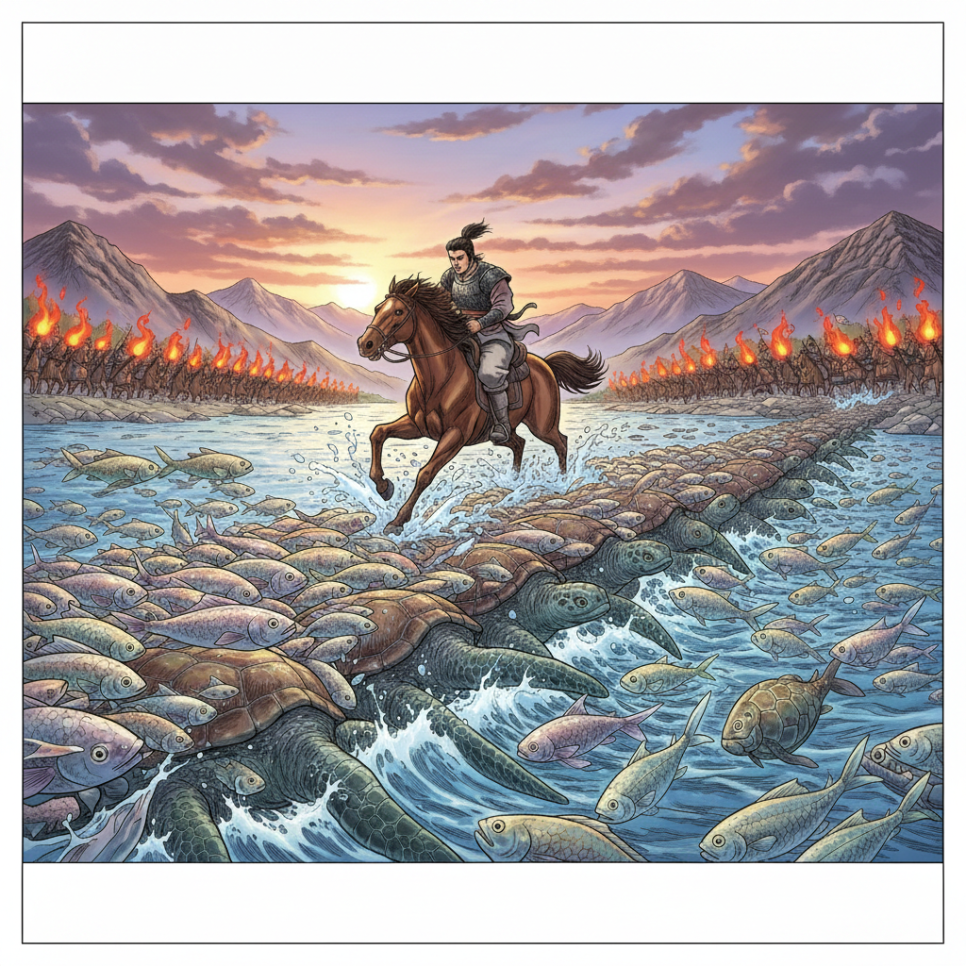 부여를 탈출한 주몽 일행 앞에 거대한 엄리대수가 나타났어요. 강폭은 너무나 넓고 물살은 거셌으며, 배는커녕 뗏목 하나 보이지 않았지요. 뒤를 돌아보니 어느새 대소 왕자의 군사들이 코앞까지 쫓아와 먼지를 일으키고 있었어요. 앞은 깊은 강물, 뒤는 칼을 든 적들! 절체절명의 순간에 주몽은 강을 향해 활을 높이 치켜들고 외쳤어요. "나는 천제의 아들이요, 하백의 외손자다! 오늘 내가 이곳에서 죽어야 한단 말이냐? 나를 도와다오!" 그러자 기적 같은 일이 일어났어요. 강 속에서 수천, 수만 마리의 물고기와 거북이들이 수면 위로 솟아오르더니 서로의 몸을 맞대어 길고 긴 다리를 만든 거예요. 주몽과 친구들은 그 신비로운 다리를 타고 무사히 강을 건넜어요. 뒤쫓아온 적군들이 다리에 올라타려 하자, 물고기와 거북이들은 한순간에 물속으로 사라져버렸고 추격군들은 강물에 빠지고 말았답니다.