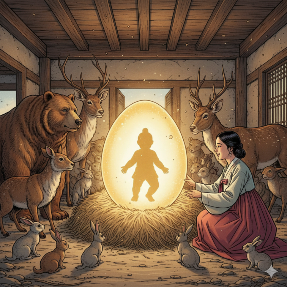 아주 먼 옛날, 북쪽 땅 부여의 금와왕은 태백산 남쪽 우발수라는 곳에서 눈물짓고 있는 아름다운 여인 유화를 만났어요. 그녀는 하느님의 아들 해모수와 헤어진 뒤 오갈 데가 없는 처지였지요. 금와왕은 가여운 유화를 궁궐로 데려와 따뜻한 방에 머물게 했어요. 그런데 어느 날부터인가 신비로운 일이 벌어졌어요. 하늘에서 내려온 눈부신 햇빛이 유화의 몸을 부드럽게 감싸며 따라다니는 것이 아니겠어요? 유화가 몸을 피해도 햇빛은 구석구석 그녀를 비추었지요. 그렇게 시간이 흐른 뒤, 유화는 아기가 아닌 커다란 알 하나를 낳고 말았어요. 깜짝 놀란 금와왕은 "사람이 알을 낳다니, 이건 불길한 징조다!"라며 알을 빼앗아 돼지우리와 외양간에 던져버렸어요. 하지만 신기하게도 돼지와 소들은 알을 밟지 않고 오히려 자기 몸으로 알을 따뜻하게 보호해주었답니다. 숲속의 새들도 날아와 깃털로 알을 감싸주었지요. 결국 왕은 알의 범상치 않음을 깨닫고 유화에게 돌려주었습니다.