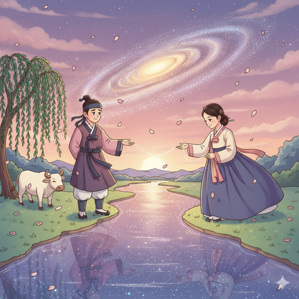 삽화: 은하수 강가에서 처음 만난 견우와 직녀. 두 사람은 마주 보며 미소 짓고 있고, 배경의 은하수는 반짝이는 별빛으로 가득하다. 견우의 소들은 옆에서 평화롭게 쉬고 있으며, 하늘에는 분홍빛 노을이 물들어 있다.