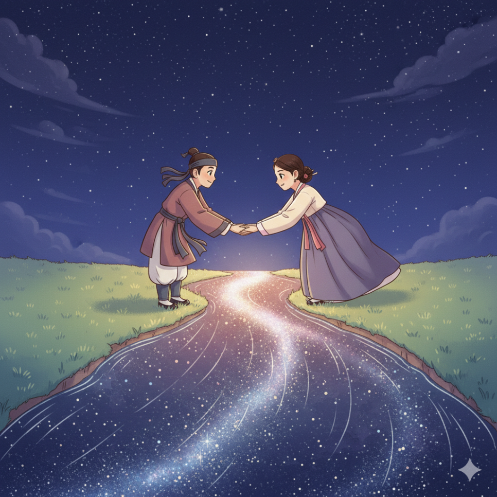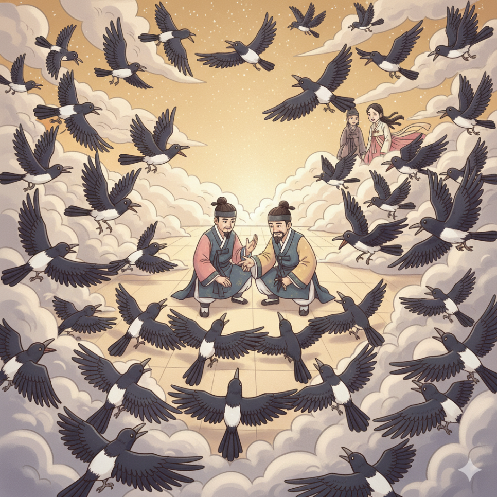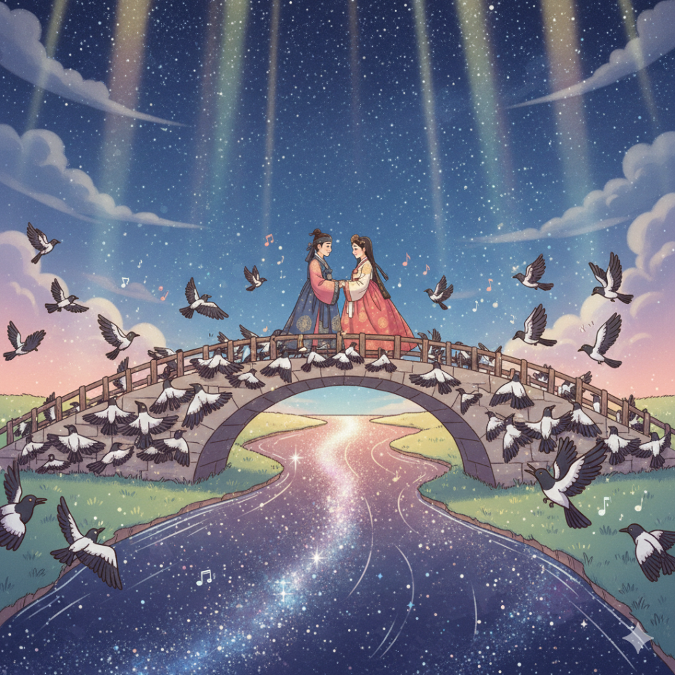 삽화: 은하수 위에 펼쳐진 장엄한 오작교. 수만 마리의 까치와 까마귀가 날개를 펼쳐 다리를 만들고, 그 위에서 견우와 직녀가 포옹하고 있다. 하늘에는 축복의 별빛이 쏟아지고, 새들은 행복하게 노래하고 있다.