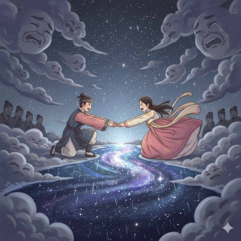 삽화: 넓게 흐르는 은하수를 사이에 두고 떨어진 견우와 직녀. 견우는 서쪽에서, 직녀는 동쪽에서 서로를 향해 손을 뻗고 있지만 닿지 않는다. 은하수는 반짝이는 별빛으로 가득하지만, 두 사람의 표정은 슬픔에 잠겨 있다.