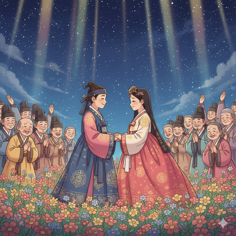 삽화: 별빛 아래에서 손을 맞잡은 견우와 직녀. 두 사람은 전통 혼례복을 입고 있으며, 주변에는 축하하는 신선들과 형형색색의 꽃들이 가득하다. 하늘에서는 축복의 별빛이 쏟아지고 있다.