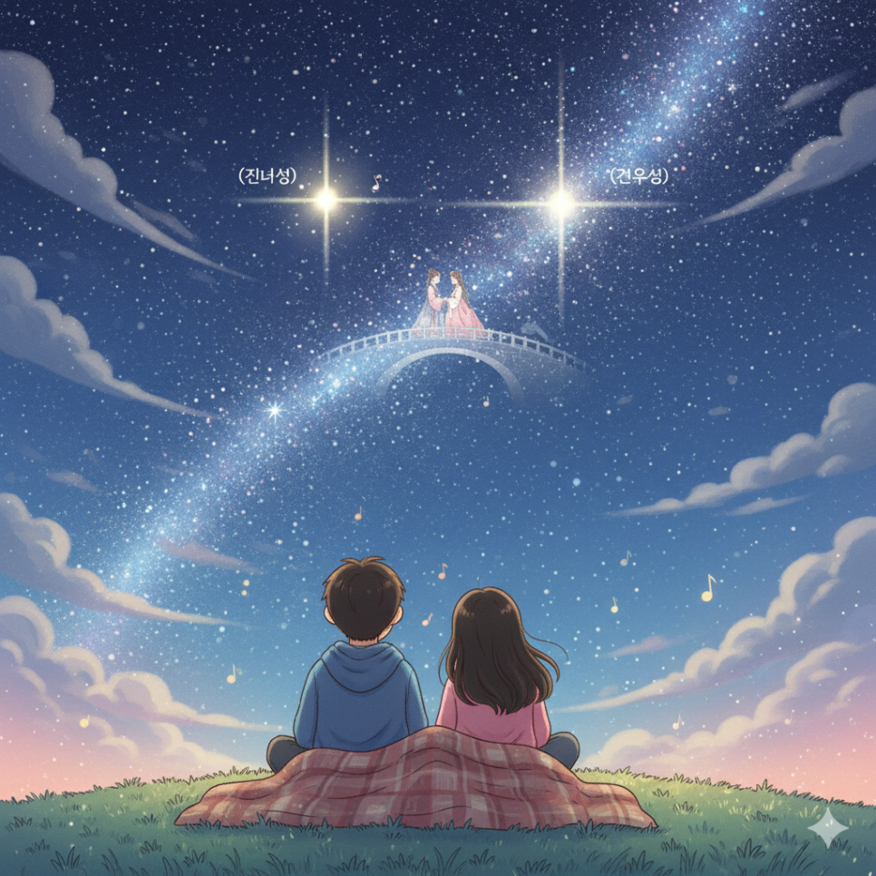 사랑하는 어린이 여러분, 여러분도 여름 밤에 하늘을 올려다보세요. 은하수를 사이에 두고 반짝이는 두 별을 찾을 수 있을 거예요. 그리고 기억하세요. 진정한 사랑은 함께 있는 시간의 길이가 아니라, 서로를 생각하는 마음의 깊이라는 것을요.