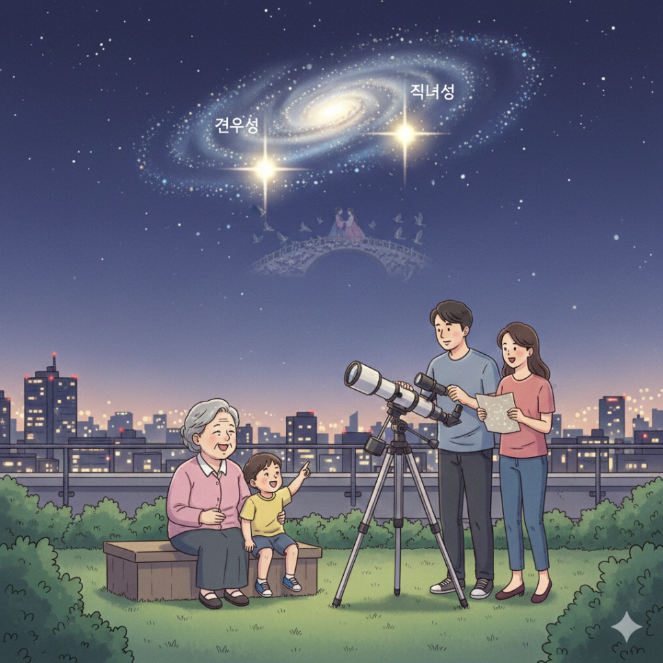 삽화: 책을 읽고 있는 부모와 아이의 따뜻한 모습. 창밖으로는 별이 가득한 밤하늘이 보이고, 책장에는 견우와 직녀가 오작교에서 만나는 장면이 펼쳐져 있다. 방 안은 은은한 조명으로 포근하고, 아이는 별을 가리키며 신나게 이야기하고 있다.