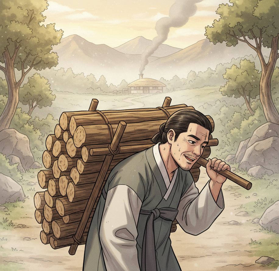 김씨는 매일 새벽같이 일어나 산으로 나무를 하러 갔습니다. 등에는 커다란 지게를 지고, 손에는 낫을 들고 가파른 산길을 올랐습니다. 나무를 해다 팔아야 어머니를 봉양할 수 있었기 때문입니다. 여름에는 뜨거운 햇볕이, 겨울에는 매서운 바람이 김씨를 괴롭혔지만 김씨는 한 번도 힘들다는 내색을 하지 않았습니다. 지게 가득 나무를 지고 산을 내려올 때면 등이 휘고 다리가 후들거렸습니다. 하지만 집에 돌아와 어머니의 얼굴을 보면 그 모든 피로가 눈 녹듯 사라졌습니다. "오늘도 수고했구나, 우리 아들" 하시는 어머니의 말씀 한마디에 김씨는 새 힘을 얻었습니다. 마을 사람들이 "그렇게 고생하지 말고 어머니를 남의 집에 맡기지 그러느냐"고 말했지만, 김씨는 고개를 저었습니다. "어머니는 제가 모셔야 합니다. 그것이 자식의 도리입니다." 김씨의 지게는 무거웠지만, 그의 마음은 언제나 가벼웠습니다.