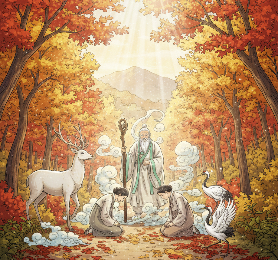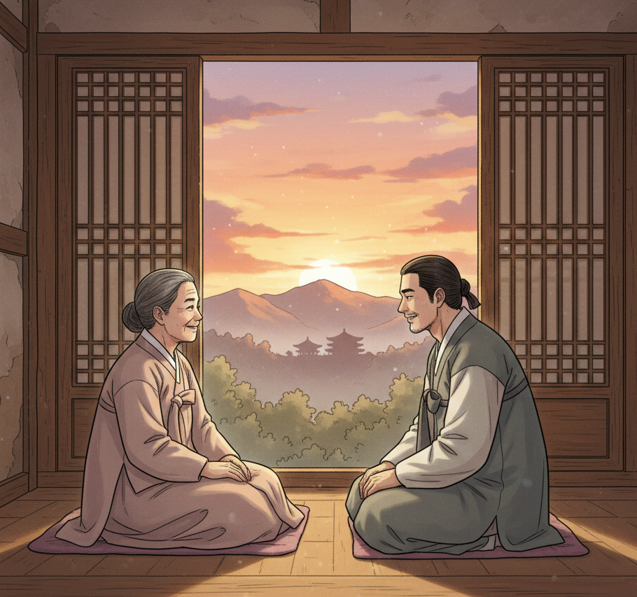 갑자기 앞에 한 노인이 나타났습니다. 흰 수염에 흰 옷을 입은 노인은 지팡이를 짚고 미소를 지으며 서 계셨습니다. 김씨는 깜짝 놀라 멈춰 섰습니다. "누구십니까?" 노인은 부드러운 목소리로 말했습니다. "나는 이 산을 지키는 산신령이니라. 네 효심에 감동하여 나타났노라." 김씨와 어머니는 너무 놀라 말을 잇지 못했습니다. 산신령은 계속 말했습니다. "천 년 만 년 효자는 많았지만, 네처럼 진심으로 어머니를 사랑하는 아들은 드물다. 가난해도 불평하지 않고, 힘들어도 웃으며, 오직 어머니의 행복만을 생각하는 너의 마음이 하늘에 닿았느니라." 산신령은 지팡이로 지게를 가볍게 두드렸습니다. 그러자 지게에서 더욱 밝은 빛이 나왔습니다. "이제 이 지게는 네 효심만큼 가벼울 것이다. 구름처럼, 바람처럼 가벼워져서 너와 네 어머니를 편히 절까지 모실 것이니라." 김씨는 눈물을 흘리며 절을 올렸습니다. "고맙습니다, 산신령님." 산신령은 미소 지으며 사라졌습니다. 그리고 정말로 지게는 아무 무게도 느껴지지 않았습니다. 어머니도 눈물을 흘리시며 하늘에 감사의 기도를 올리셨습니다.