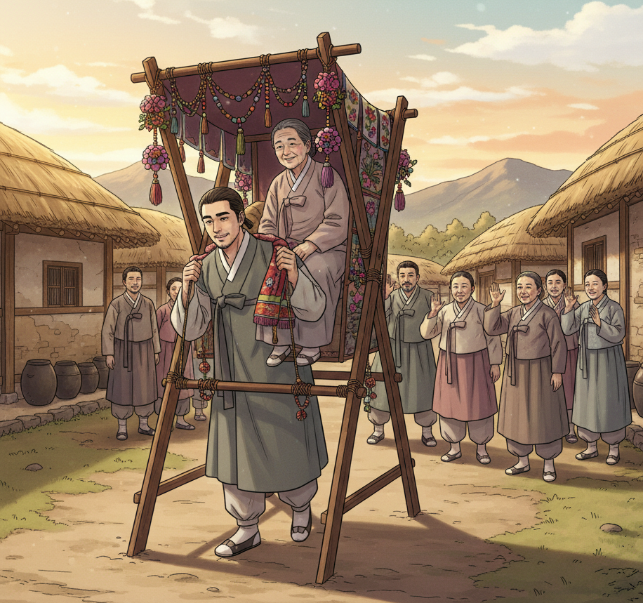 어느 가을날 저녁, 어머니께서 김씨를 부르셨습니다. "얘야, 어머니가 소원이 하나 있단다." 김씨는 어머니 곁으로 다가가 무릎을 꿇고 앉았습니다. "무슨 소원이신데요, 어머니?" 어머니는 창밖 먼 산을 바라보시며 말씀하셨습니다. "저 산 너머에 있다는 영험한 절에 가서 부처님께 절을 올리고 싶구나. 네가 건강하게 오래오래 살기를 빌고 싶어서 말이다." 김씨는 가슴이 뭉클했습니다. 당신의 소원이 아니라 아들을 위한 기도를 하고 싶다는 어머니의 마음에 눈물이 났습니다. 하지만 걱정도 되었습니다. 그 절은 험한 산길을 넘어야 하는 먼 곳이었고, 어머니는 혼자 걸으실 수가 없으셨으니까요. 밤새도록 고민하던 김씨는 문득 좋은 생각이 떠올랐습니다. "맞아! 지게에 어머니를 모시고 가면 되겠구나!" 김씨는 다음 날 아침 어머니께 말씀드렸습니다. "어머니, 제가 지게에 모시고 절에 모시고 가겠습니다." 어머니는 놀라셨지만, 김씨의 굳은 결심을 보고 고개를 끄덕이셨습니다.