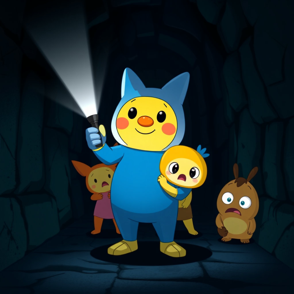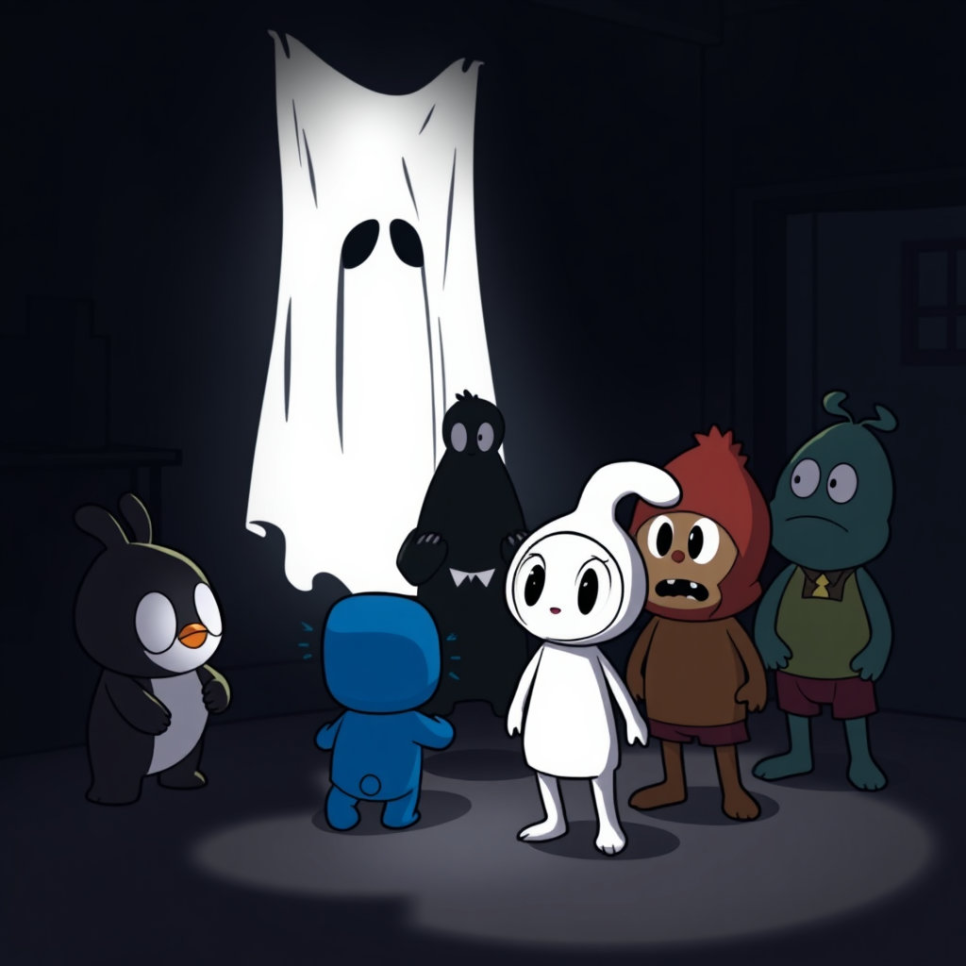 어둡고 좁은 통로를 따라 조심스럽게 나아가던 뽀로로 탐정단은 마침내 통로의 끝에 다다랐어요. 통로 끝에는 작은 방이 있었고, 그 방 안에는 하얀 천을 뒤집어쓰고 웅크리고 있는 그림자가 보였죠! 루피는 "으아! 정말 유령이다!"라며 눈을 질끈 감았어요.