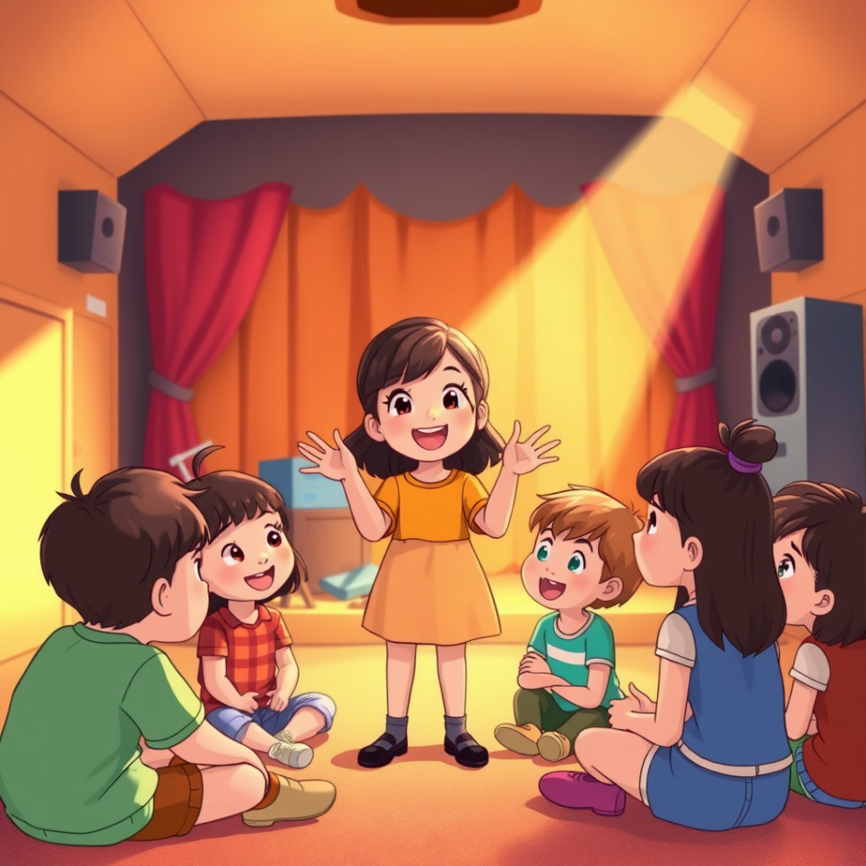 별이와 꼬마 친구들은 무대 밖에서 재미있는 게임을 했어요. 숨바꼭질도 하고, 공 던지기 놀이도 하며 모두가 웃음꽃을 피웠답니다. 함께 놀면서 우정도 더욱 깊어졌죠.