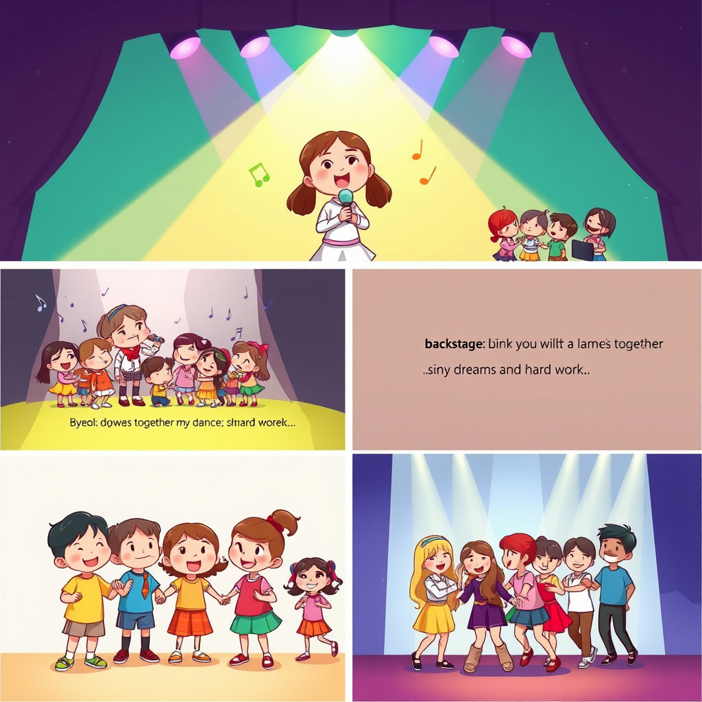 별이는 무대 뒤에서 자신의 꿈과 노력을 꼬마 친구들에게 이야기해 주었어요. 처음에는 떨리고 힘들었지만 포기하지 않았다는 이야기에 친구들은 감동했답니다. “우리도 꿈을 꼭 이루자!” 다짐했죠.