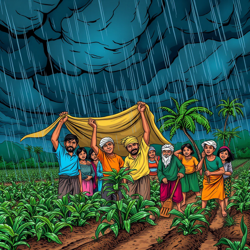 어느 날, 큰 바람과 비가 들판을 덮쳤어요. 농작물이 쓰러지고, 마을 사람들은 걱정에 잠겼죠. 하지만 모두 힘을 합쳐 다시 일어섰어요. 서로를 도우며 어려움을 이겨내는 마음이 마을을 더욱 단단하게 만들었답니다.