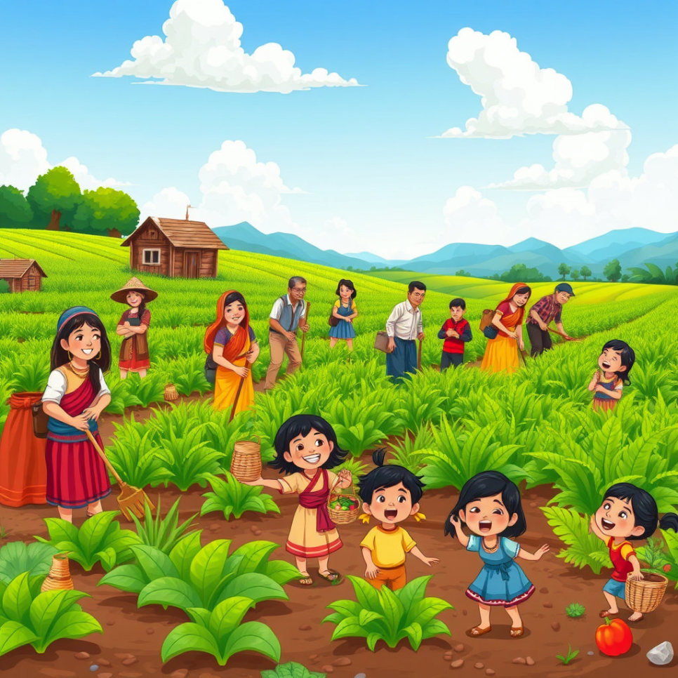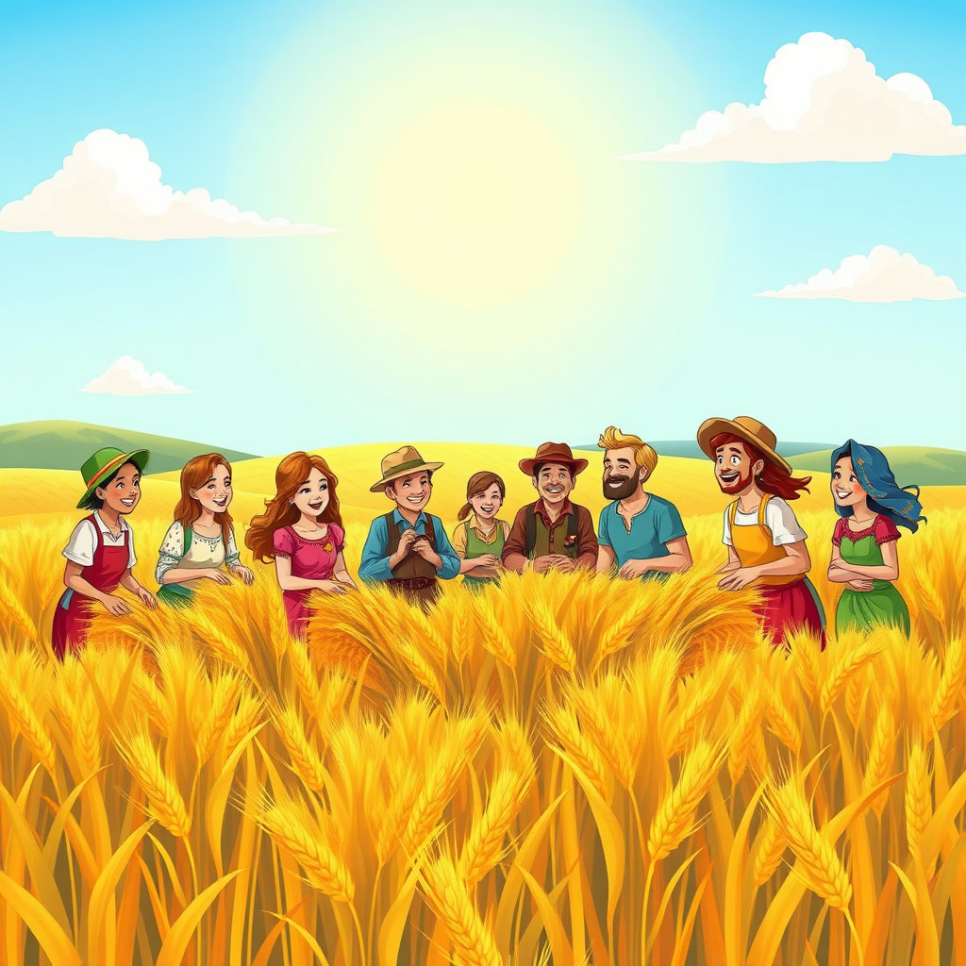 농사일은 힘들지만 모두 함께 하면 즐거웠어요. 밭을 갈고, 씨앗을 뿌리고, 물을 주는 동안 웃음소리가 끊이지 않았답니다. 아이들도 도와주며 어른들과 함께 배우고 자랐어요. 서로의 손길이 모여 풍성한 들판을 만들어 갔지요.