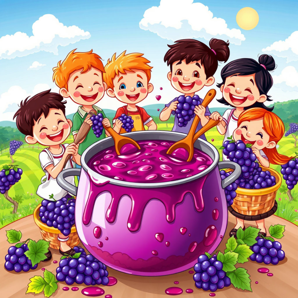 다음 날 아침, 할머니는 커다란 냄비에 포도를 넣고 주스를 만들기 시작하셨다. “이건 너희 손으로 도운 주스란다.” 아이들은 직접 포도를 씻고 눌러 즙을 짰다. 마을 어른들이 모여들어 “올해 첫 주스네!” 하며 잔을 들었다. “맛있다!” 모두가 웃으며 한 모금씩 마셨다. 아이들도 함께 마시며 따뜻함을 느꼈다. 실수는 있었지만, 사랑과 이해로 다시 웃을 수 있는 포도마을이었다.