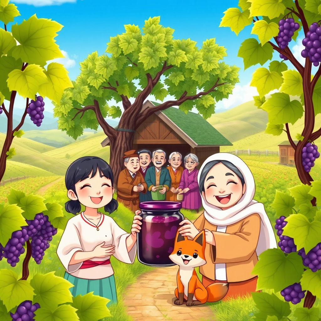 그날 저녁, 마을 할아버지가 큰 감나무 아래 아이들을 불렀다. “옛날에도 장난꾸러기들이 있었단다. 그중 한 아이는 여우를 따라가다 진짜 포도 숲을 발견했다지.” 아이들은 눈을 반짝이며 이야기에 빠져들었다. 할아버지는 포도나무가 지닌 생명의 힘과 마을의 전통을 차분히 들려주셨다. “포도는 기다림의 열매란다. 서두르면 신맛만 남지.” 아이들은 고개를 끄덕이며 진심으로 잘못을 깨달았다.