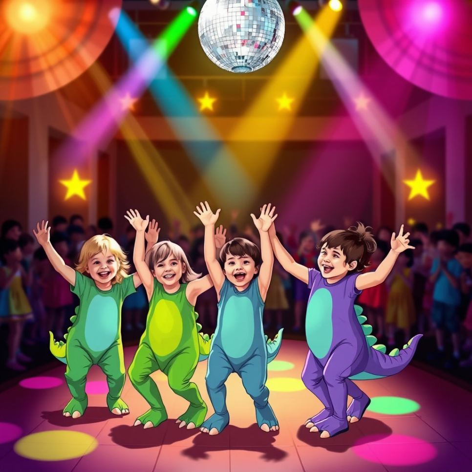 “쿵쿵! 콰앙!” 우렁찬 비트와 함께 ‘공룡 디스코’가 시작되었다. 아이들은 팔을 벌리고 다리를 크게 벌려 마치 티라노사우루스처럼 움직였다. 입으로는 ‘끼야아아!’ 소리를 내며 공룡이 된 듯 으르렁댔다. 몽이는 작은 공룡알 모양의 무대 소품을 들고 엉덩이를 흔들었다. 해별이는 앞발 흉내를 내며 목을 뒤로 젖혀 포효했고, 재이는 공룡 댄스를 하며 무대 한가운데를 휘저었다. 아이들은 신나게 뛰고 돌며 그 누구도 따라 할 수 없는 공룡춤을 완성했다. 무대가 울릴 만큼 발 구르는 소리가 컸고, 그건 곧 웃음소리로 바뀌었다.