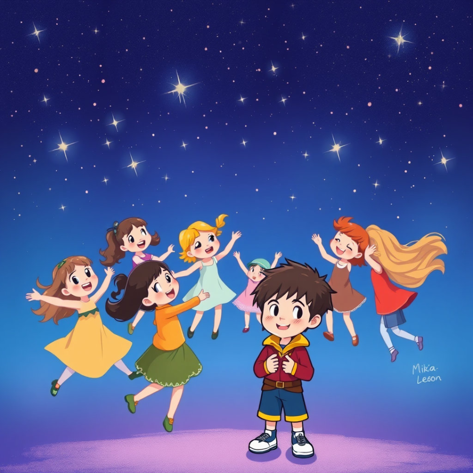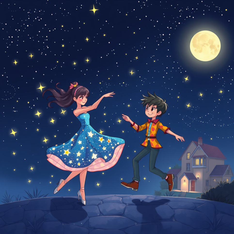 공연이 끝난 뒤, 미카와 레온은 마을 아이들과 함께 작은 무대를 만들었어요. 모두가 함께 춤을 추며 노래하고 웃었죠. 춤추는 별들이 밤하늘에 반짝이듯, 아이들의 꿈도 반짝였답니다. “우리의 춤은 끝나지 않아.” 두 친구는 앞으로도 계속 춤추며 세상을 밝힐 거예요.