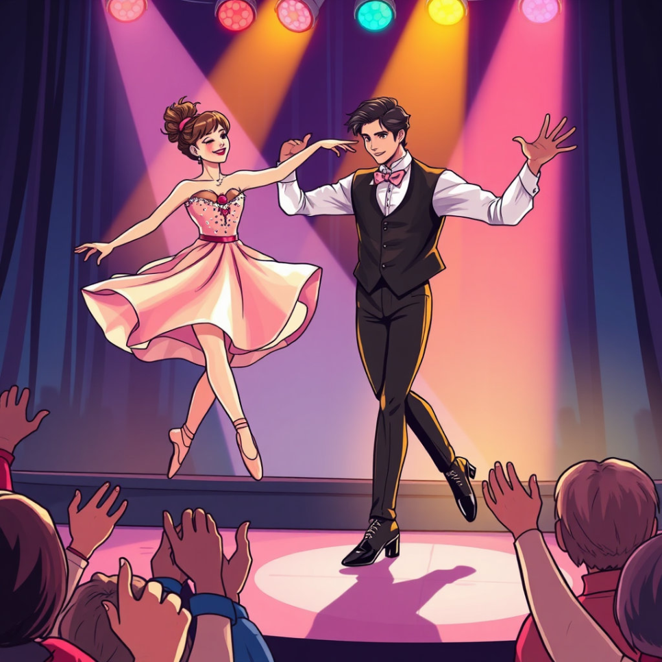공연이 시작되자 미카와 레온은 두려움 없이 춤을 추었어요. 발끝은 하늘을 향해 날고, 발뒤꿈치는 땅을 울렸죠. 춤은 자유의 노래가 되었고, 관객들은 두 친구의 용기에 감동했답니다. 이 순간, 두 소년은 진정한 꿈을 이루었어요.