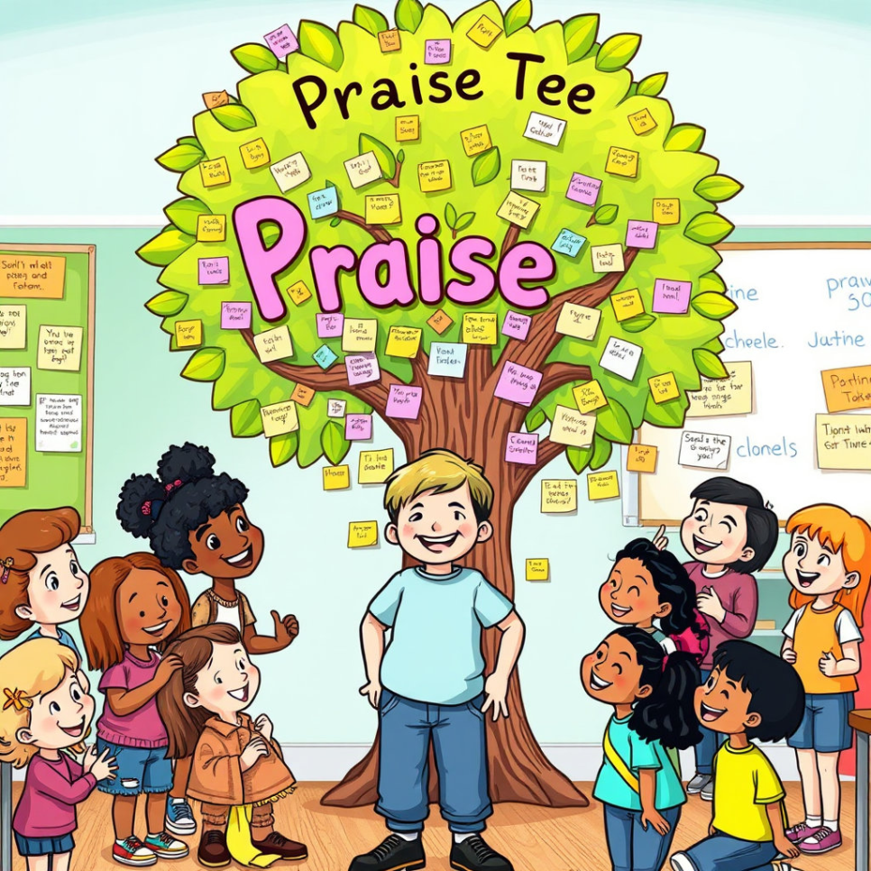 조조는 학교에서 친구들과 함께 '칭찬 나무'를 만들었어요.