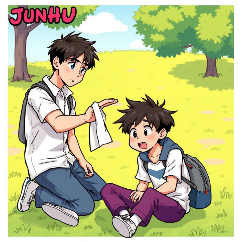 어느 날 체육 시간에 조조가 넘어졌는데, 아무 말도 없이 준호가 조용히 손수건을 내밀었어요.