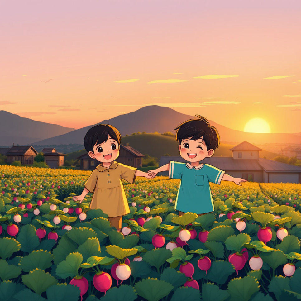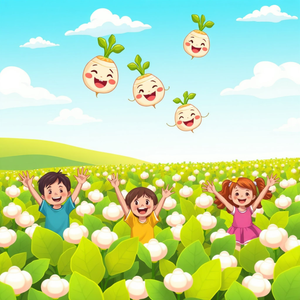 순무는 부끄럽게 미소 지으며 바람을 따라 춤을 췄어요.