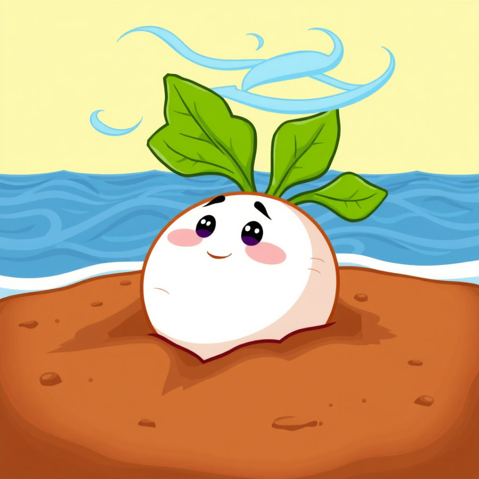 어느 가을, 순무 씨앗 하나가 강화도 황토밭에 떨어졌어요. 작고 둥근 씨앗은 말했죠. "여기가 어디지? 바람이 자꾸 나를 간질이네!" 하지만 땅속은 따뜻했고, 햇살도 부드러웠어요. 씨앗은 그곳이 마음에 들었어요. "좋아, 여기에 뿌리내릴래!" 그리고 하루하루가 지나자 작은 뿌리가 자라났고, 잎사귀도 파랗게 올라왔어요. 그렇게 씨앗은 순무 아기가 되어 세상과 인사를 했어요.