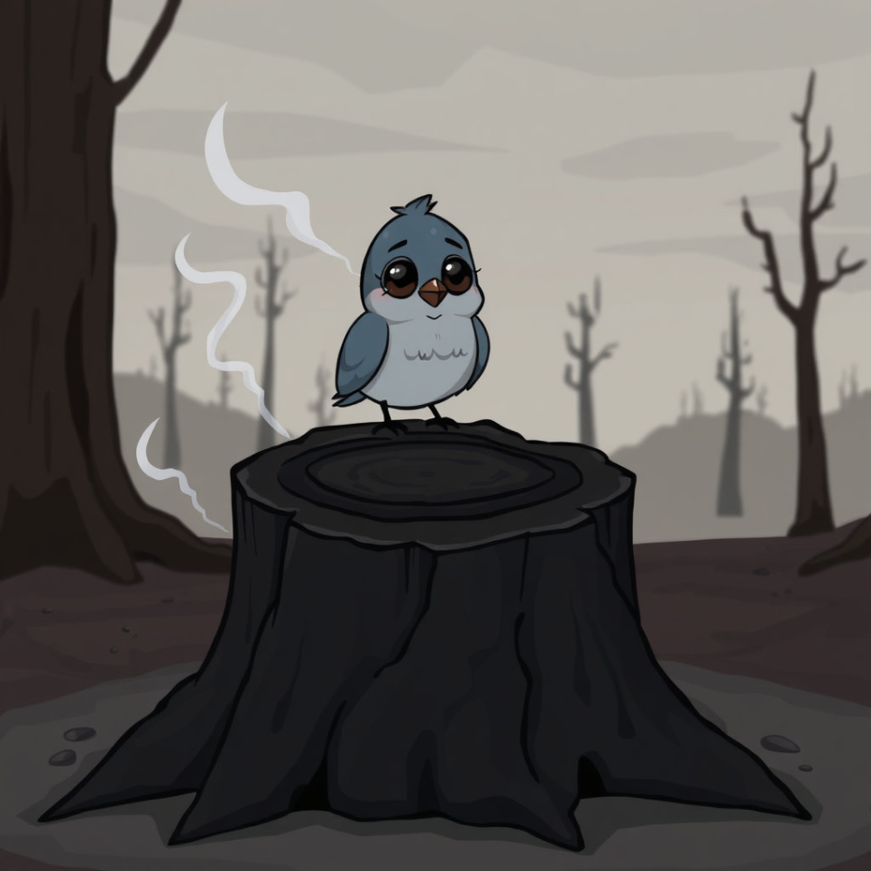 나무가 타면 그 자리에는 아무것도 남지 않아요. 식물들이 불에 타 죽으면 땅이 말라버려서 다시 나무가 자라기 어려워져요. 숲은 마치 큰 집처럼 자라고 다시 채워져야 하는데, 불에 타면 그 시간이 아주 오래 걸려요. 불에 탄 나무는 새집을 잃은 새처럼 외롭고 슬퍼해요. 그래서 산불이 나지 않도록 항상 주의해야 해요.