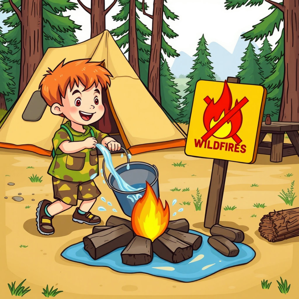 산불을 막으려면 불을 사용할 때 항상 조심해야 해요. 캠핑할 때 불을 끌 때는 반드시 완전히 꺼야 하고, 담배도 숲에서는 피우면 안 돼요. 불장난은 절대 하지 말고, 산불 위험 경고가 있을 때는 특히 주의해야 해요. 그리고 산불을 발견하면 바로 어른에게 알려야 한답니다.