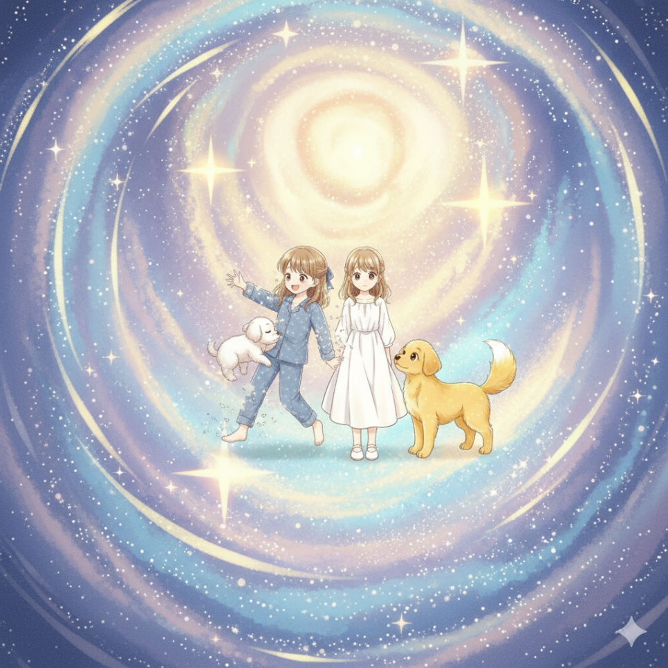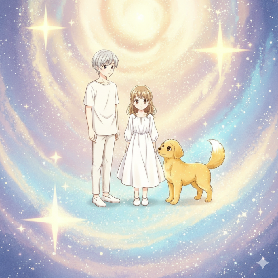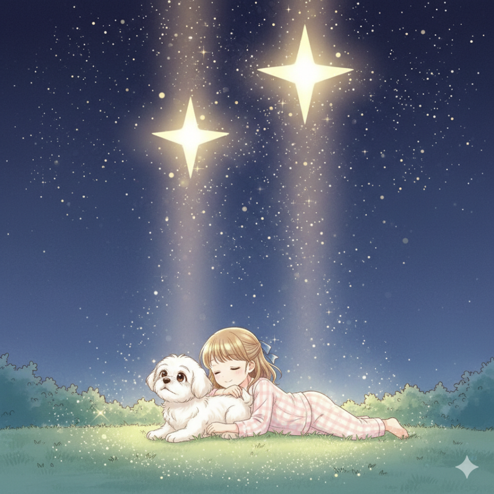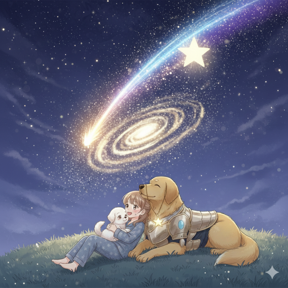 밤하늘의 반짝이는 별 하나가 지구로 떨어지며, 작은 강아지로 다시 태어나요.