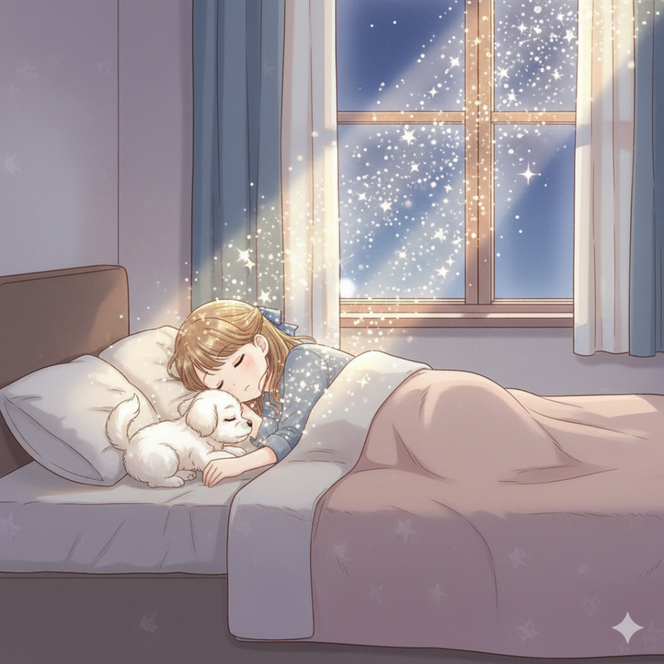 밤이 되자 별이는 민아의 곁에 누워 꿈을 꾸었어요.