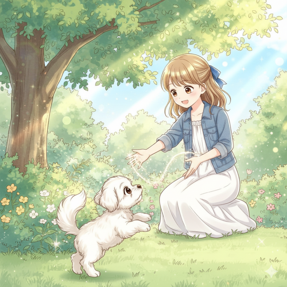 민아가 손을 내밀자, 강아지는 마치 오래된 친구를 만난 듯 따뜻하게 손을 핥았어요.
