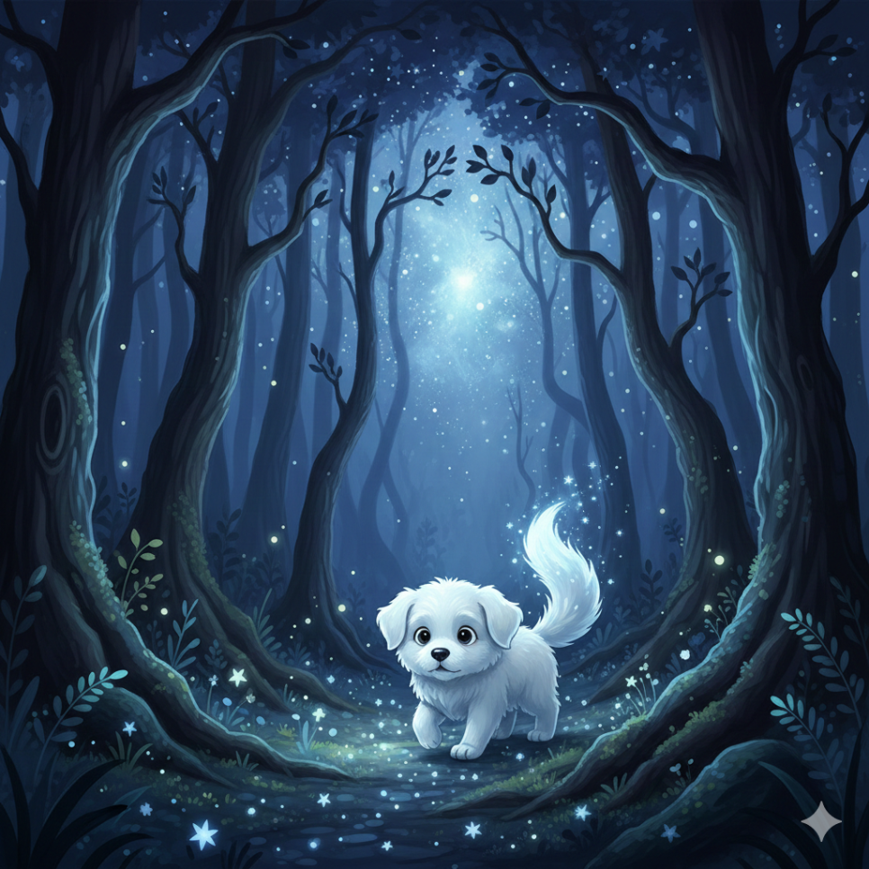 그 자리에 조그만 강아지 한 마리가 생겨났어요. 눈처럼 하얀 털, 꼬리 끝에는 반짝이는 빛이 맺혀 있었답니다.