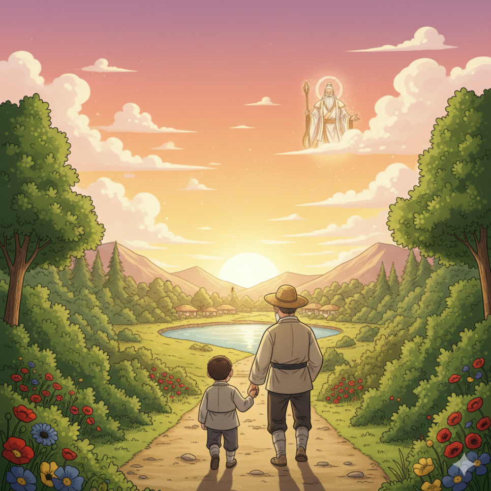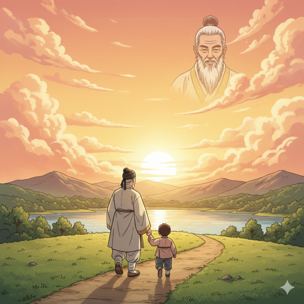 해가 저물어갈 무렵, 할아버지와 손자는 손을 잡고 산을 내려갔습니다. 그들의 뒷모습에는 저녁 노을이 따뜻하게 내려앉았습니다.