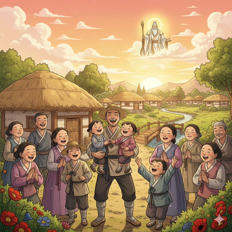 "나무꾼 덕분에 밥을 먹었어요!" "우리 아이가 나았어요, 고맙습니다!" 마을 사람들은 나무꾼에게 감사했습니다. 나무꾼은 쇠도끼로 여전히 성실하게 나무를 하며 살았습니다.